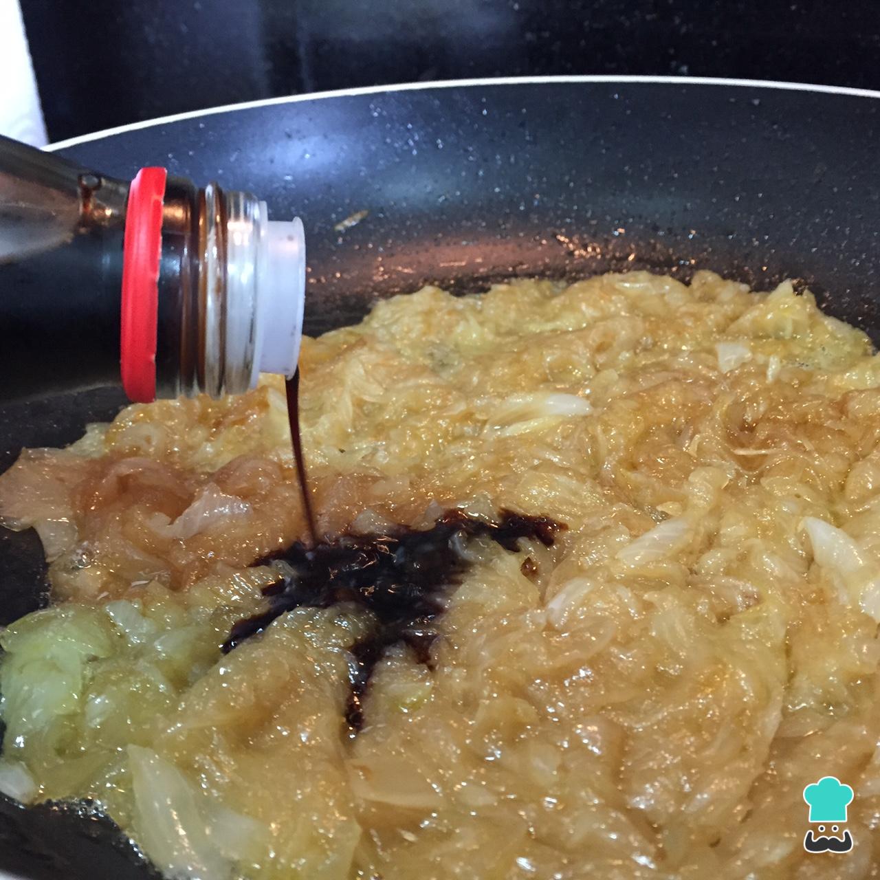 Y agregamos el vinagre de Módena, unas dos cucharaditas que ayudarán a que el caramelo no se solidifique y lo mantendremos en el fuego otros 10 minutos aproximadamente para suavizar el sabor del vinagre.