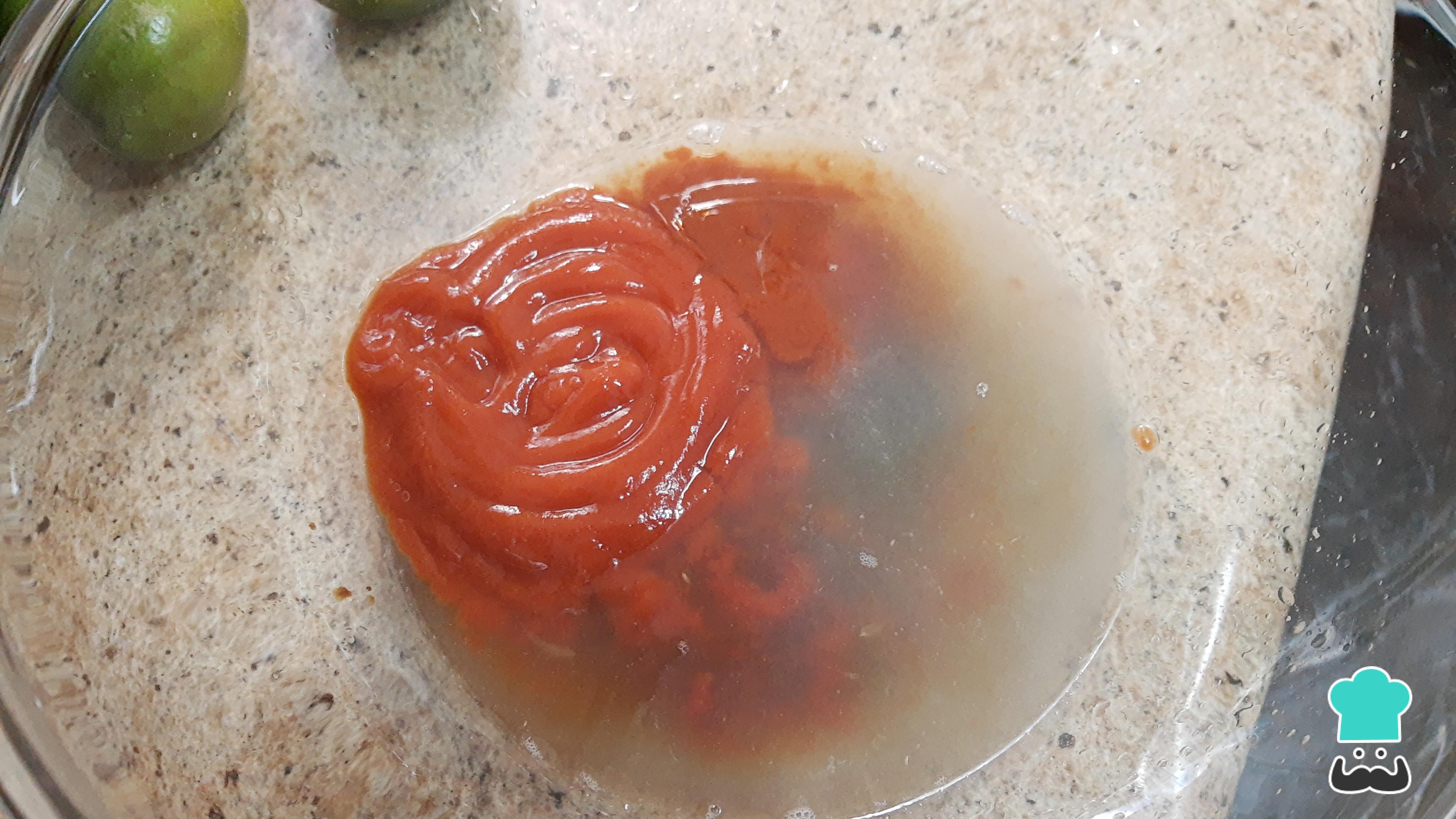 Mientras reposa y se marina el camarón prepara la mezcla de salsas. En un recipiente coloca media taza de salsa cátsup, el jugo de 10 limones, 3 cucharadas de salsa inglesa, 3 cucharadas de jugo sazonador, 4 cucharadas de salsa Tabasco, sal y pimienta al gusto, mezcla todo muy bien hasta que se integre, reserva. Puedes sustituir la salsa Tabasco por alguna otra salsa picante al gusto.