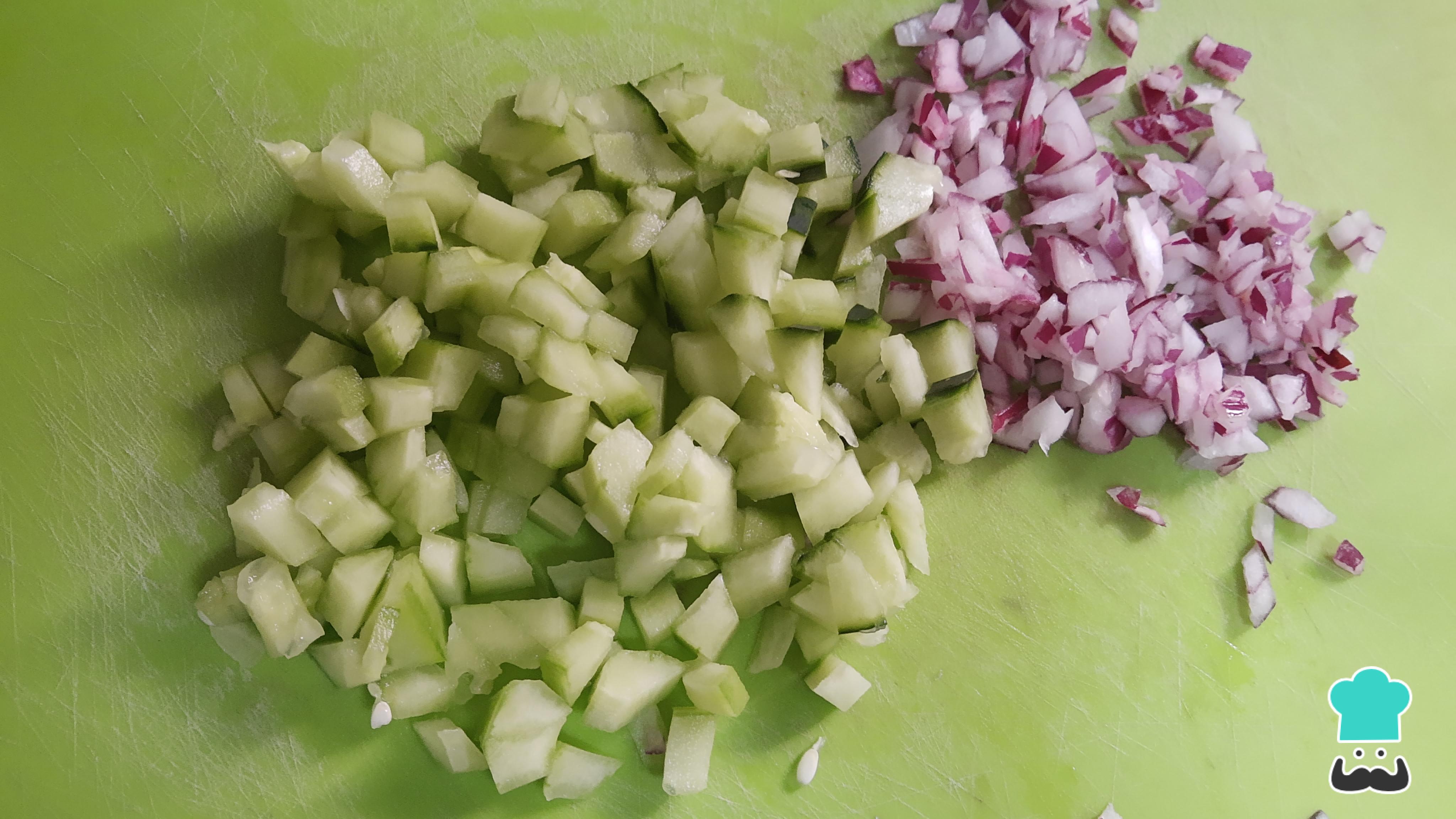 Pela el pepino y retira las semillas. Luego, pica en cubos pequeños, también pica finamente la cebolla está puede ser morada o blanca elige la que más te guste. Además del pepino puedes agregar jitomate si así lo deseas.