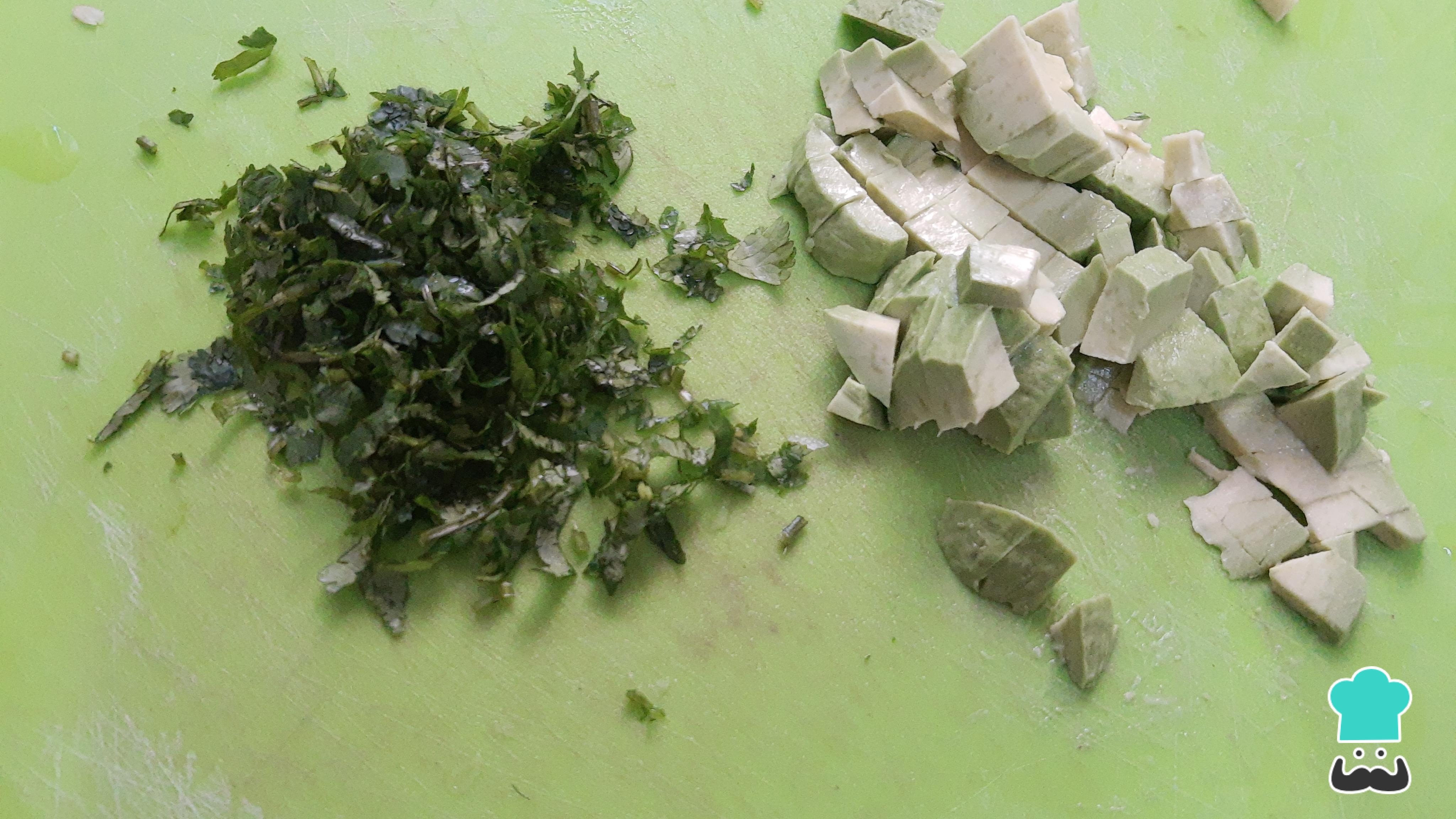 También pica finamente el cilantro,que debe estar limpio y desinfectado, puedes usar solo las hojas o usar la rama completa. De igual forma pela el aguacate y pica en cubos pequeños o medianos, reserva todos los ingredientes en un recipiente.