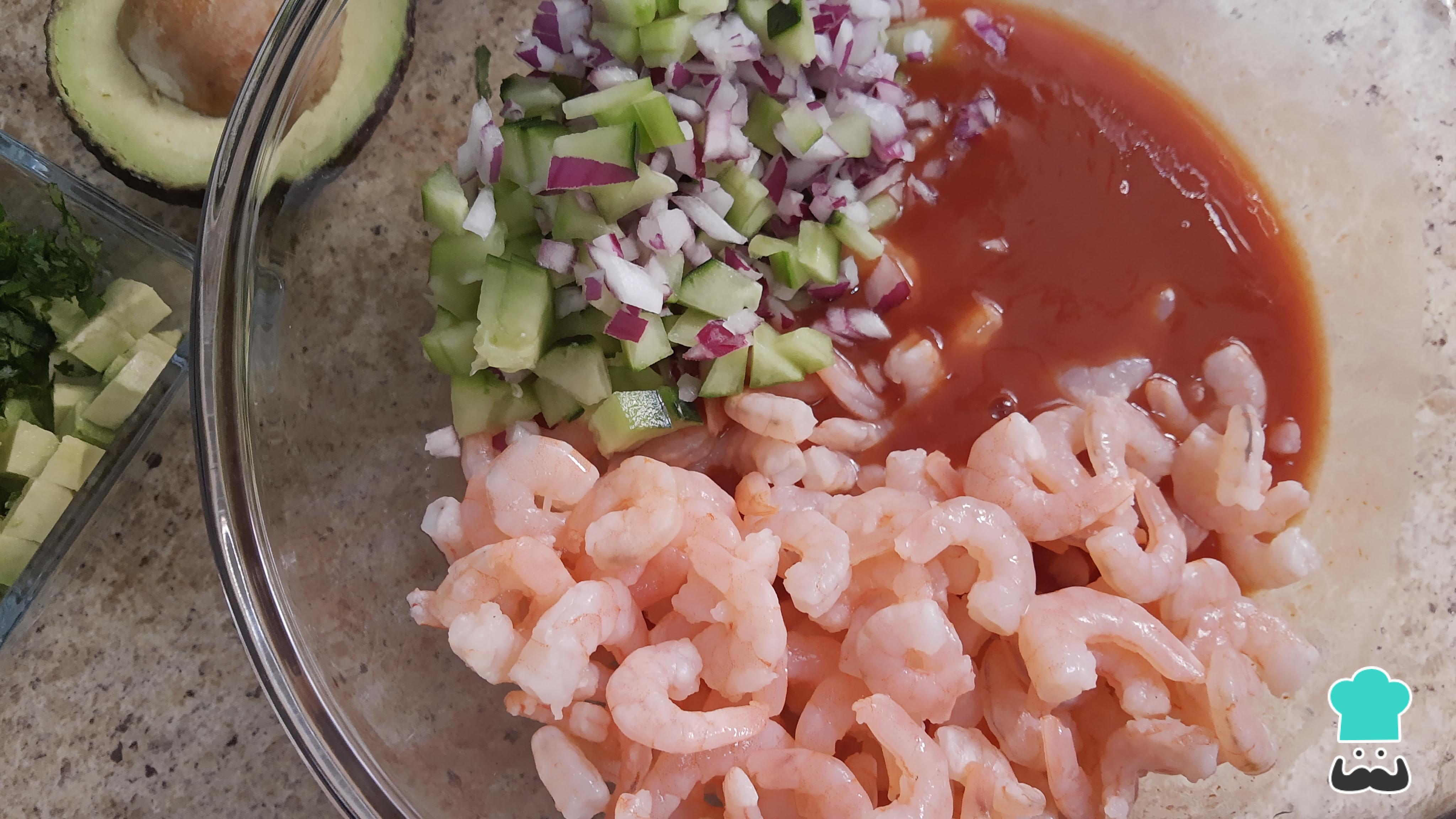 Por último, solo falta integrar todo. En un recipiente coloca las salsas mezcladas y, enseguida, los camarones marinados, el pepino, la cebolla, el cilantro y el aguacate. Mezcla todo muy bien para que se integre y deja reposar para que se asienten los sabores.