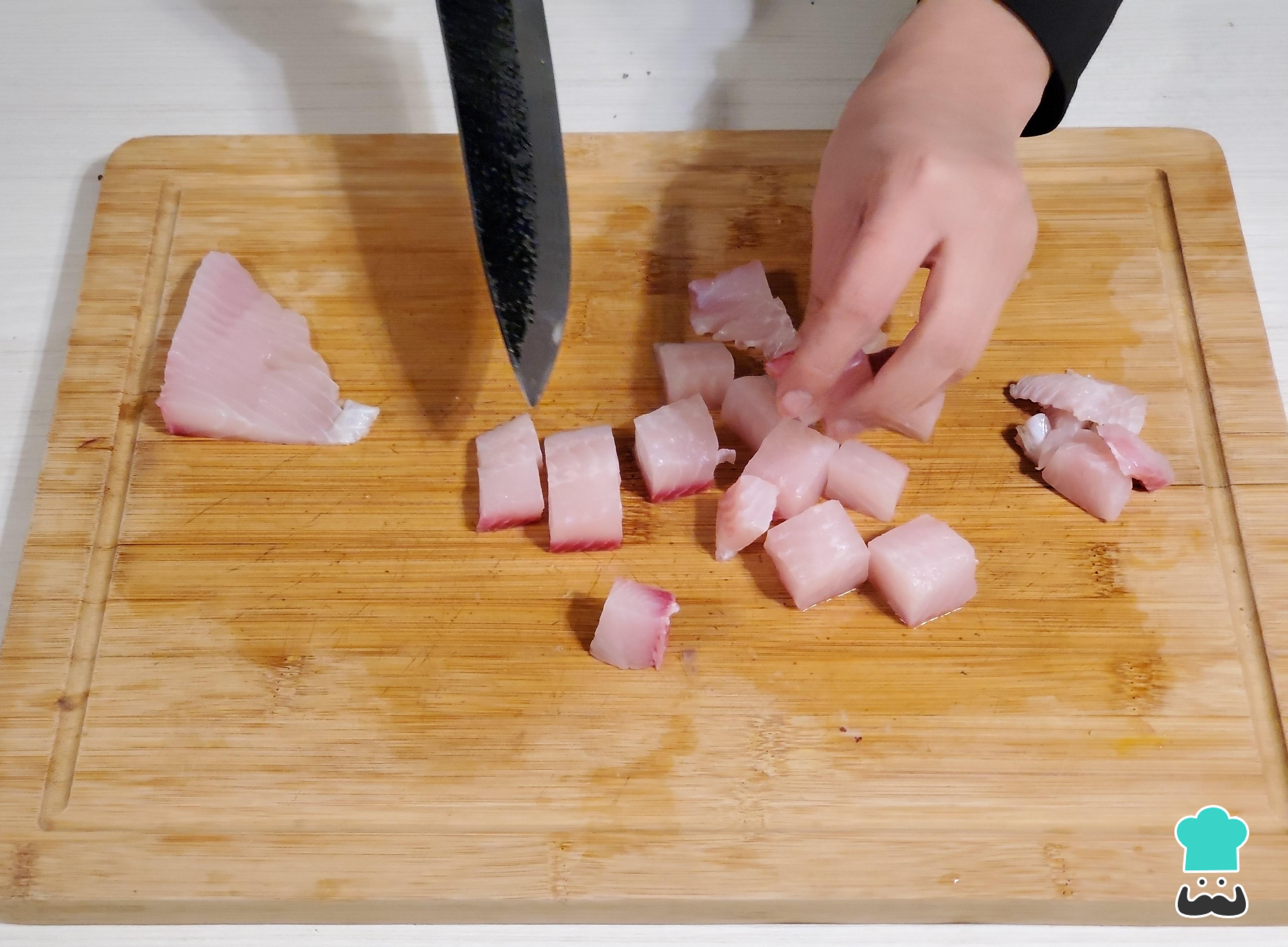 Comienza cortando el pescado en filetes, eliminando espinas y piel. Corta los filetes en cubos uniformes de aproximadamente 2 centímetros. Reserva los restos de pescado para preparar la leche de tigre para el ceviche.