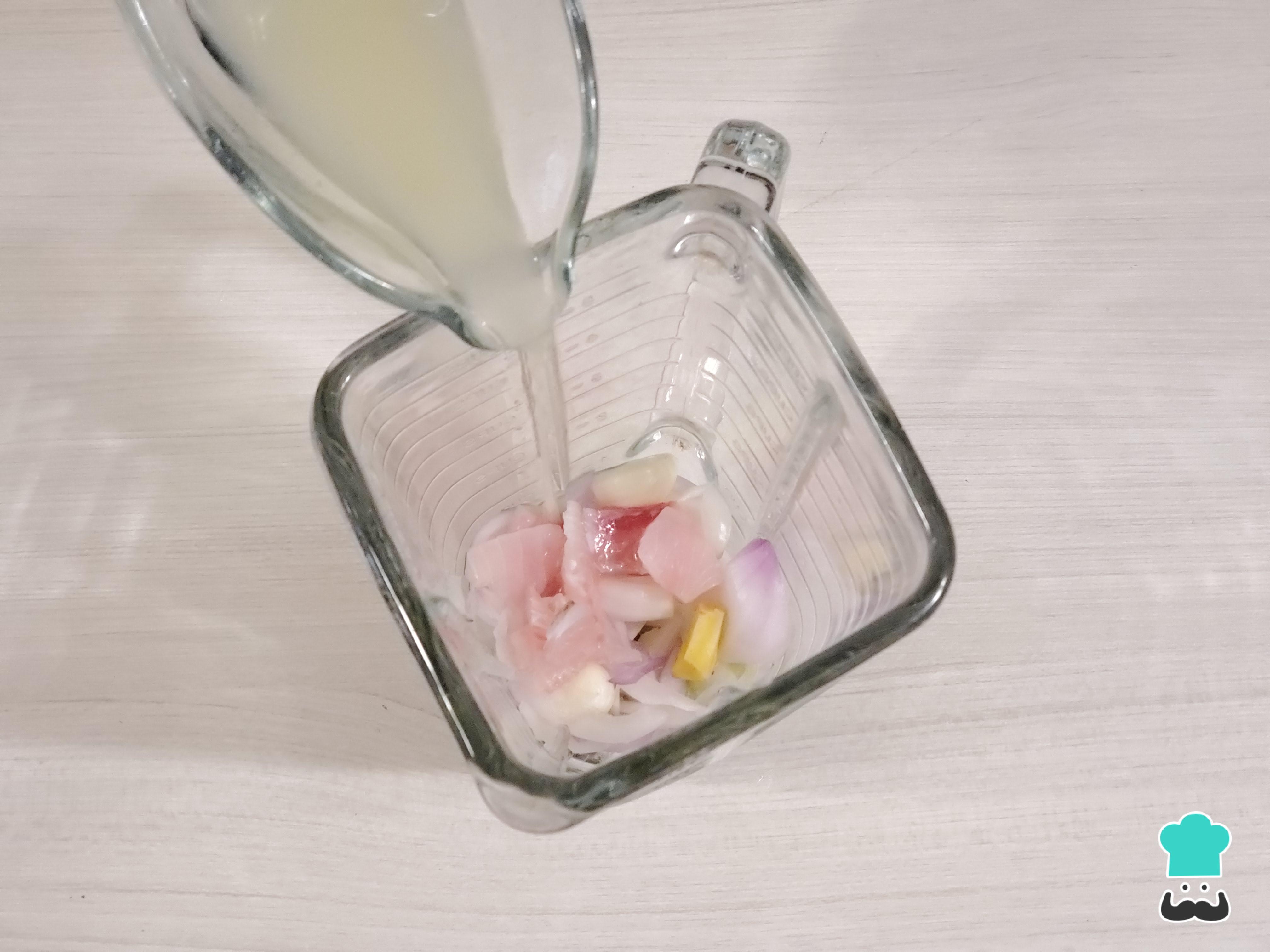 Para preparar la leche de tigre, coloca en el vaso de la licuadora unos dientes de ajo, un trozo de kion, media rama de apio, unas ramas de culantro, el jugo de 4 limones, un trozo de cebolla, un cucharón de chilcano o fumet, los restos de pescado y media cucharadita de sal.