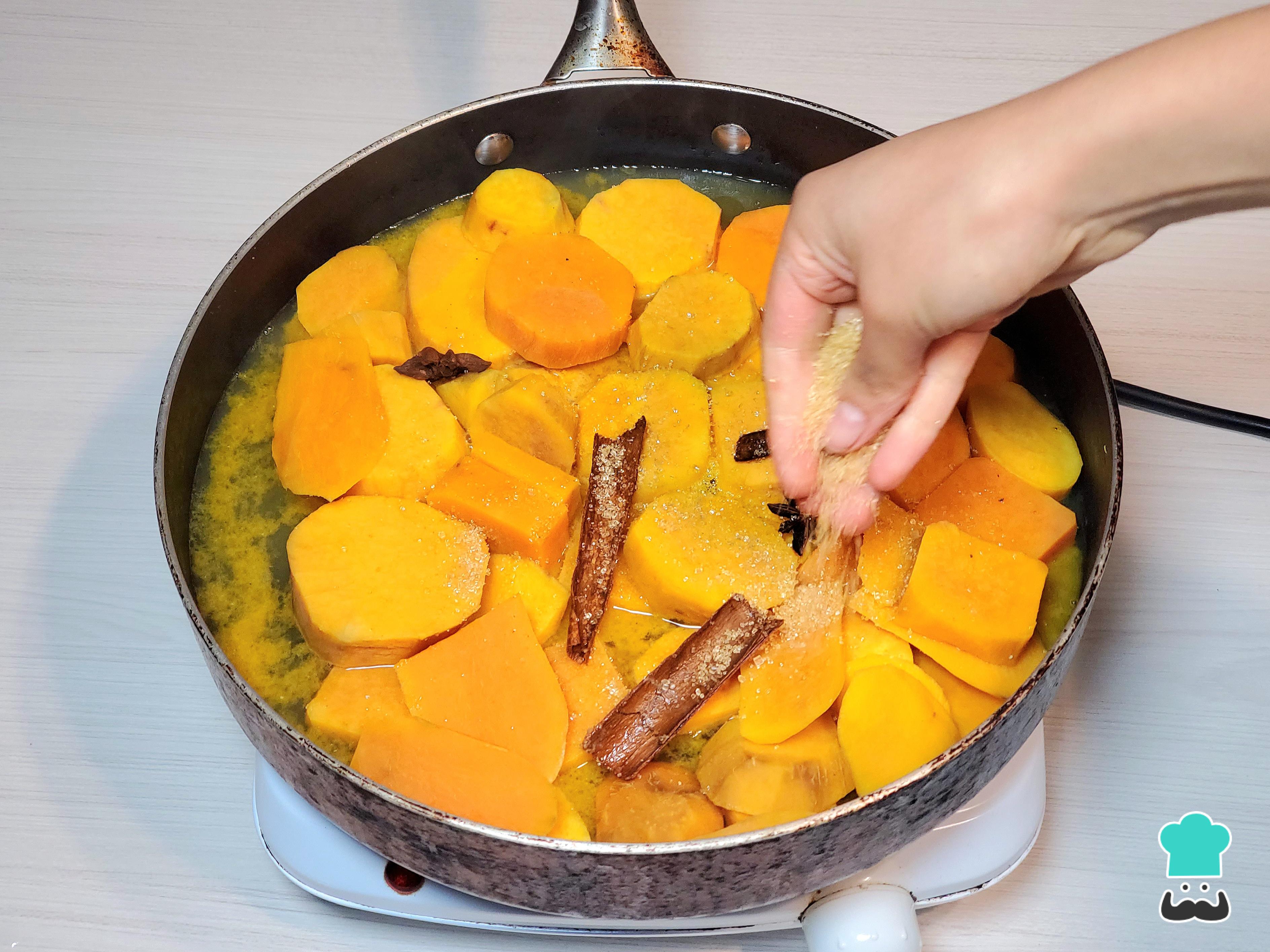 Sancocha los camotes hasta que estén tiernos pero firmes. Si deseas, glaséalos con un poco de miel. Cocina los choclos y desgránalos una vez fríos.