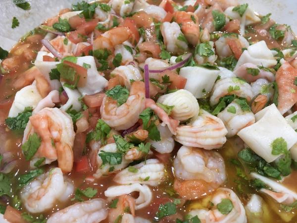 Una vez ha pasado ese tiempo, sacamos el ceviche de camarón estilo Perú de la refrigeradora y lo servimos acompañado de ají, patacones o canguil.