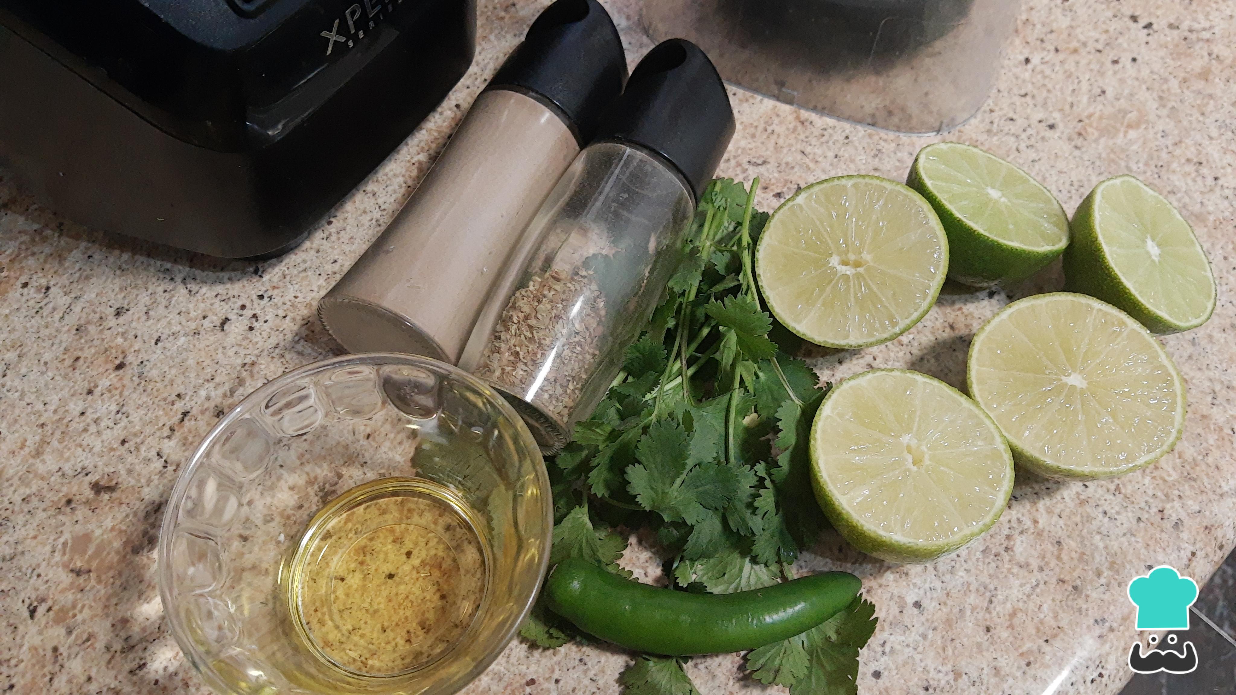 Para hacer la receta de ceviche de queso panela, primero prepara el aderezo. Para ello, lleva a licuar el jugo de limón, la ramita de cilantro, un chile serrano sin tallo, una pizca de orégano seco, sal, pimienta al gusto y aceite de oliva. Cuando esté listo, reserva.
