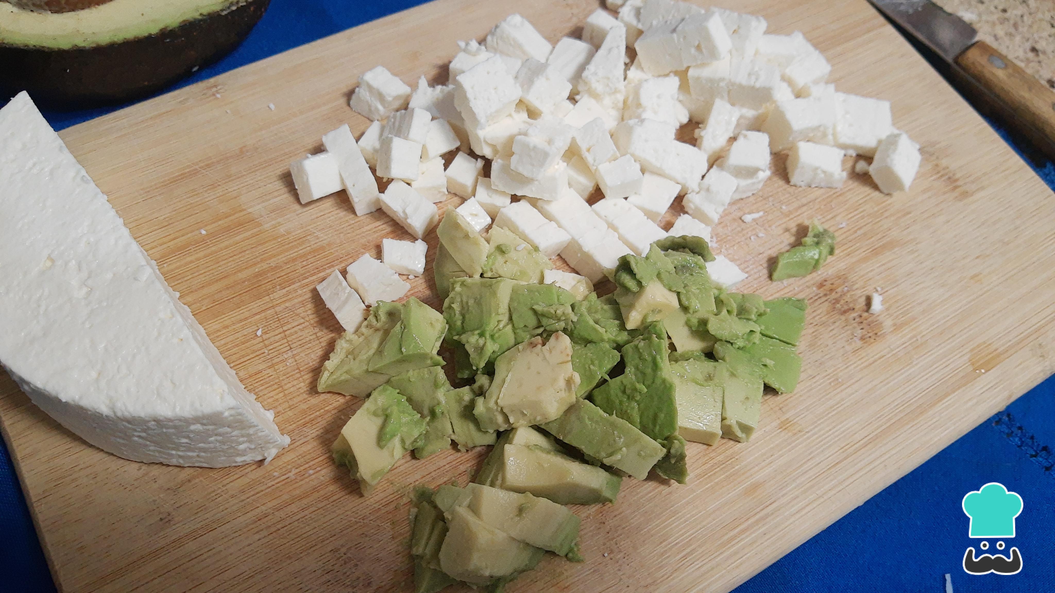 Corta en cubos pequeños el queso panela, el tamaño que debe quedar es para que pueda ser comido en bocados. También pica el aguacate, reserva ambos ingredientes.