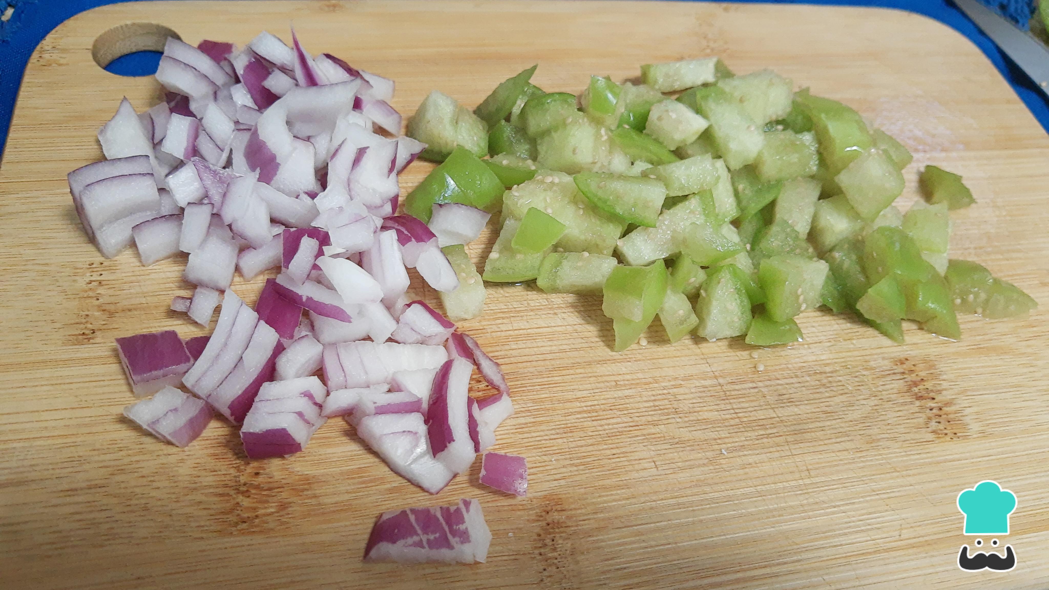 Pica la cebolla morada, puede ser en cubos o en julianas. También pica el tomatillo o tomate verde, este no es necesario retirar las semillas, solo asegúrate de lavarlo muy bien y retirar un poco de la parte donde está el tallo.