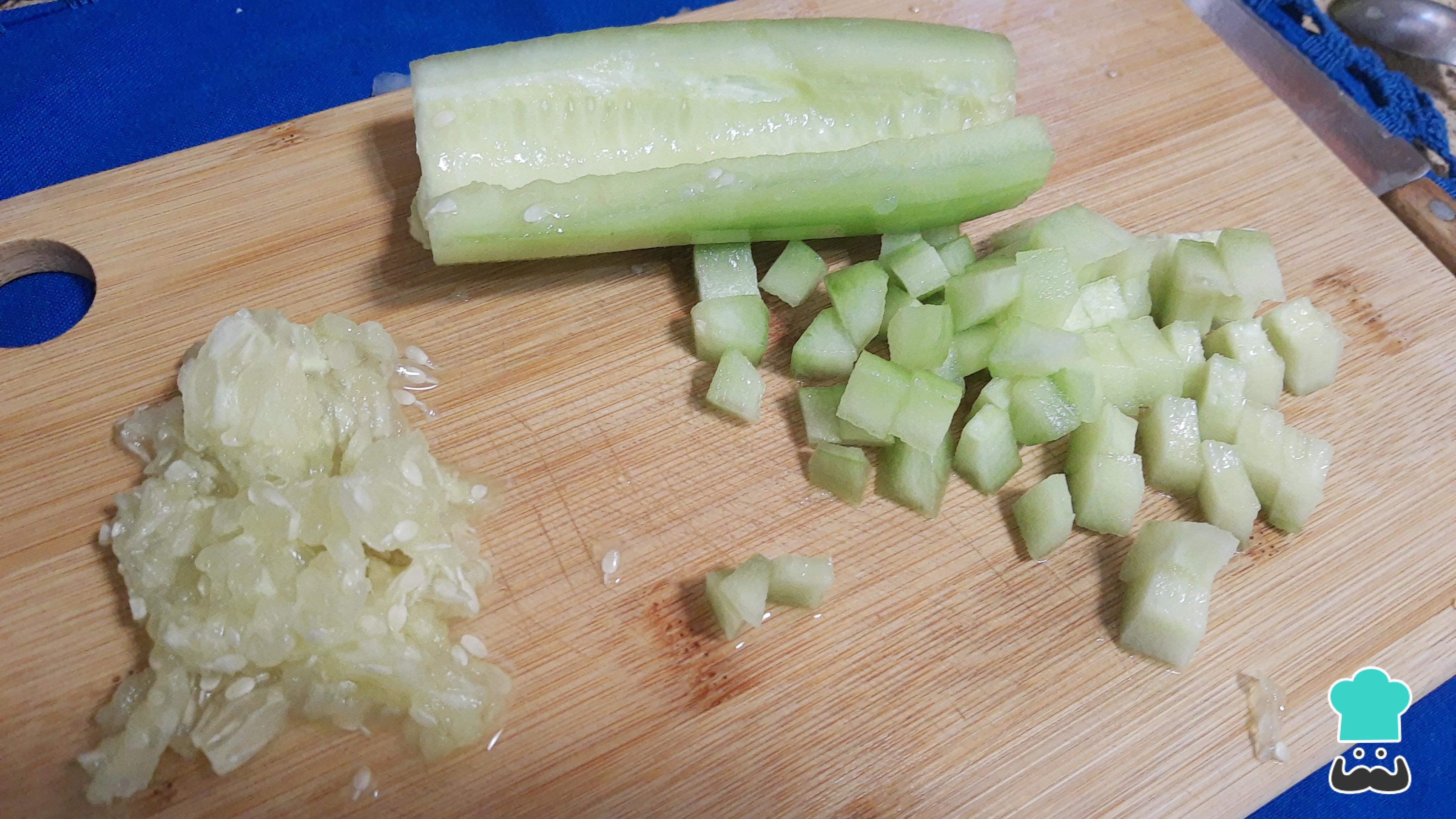Pela y retira semillas al pepino. Luego, corta en cubos del tamaño similar al resto de los ingredientes, puedes dejar la cáscara del pepino, pero esto es completamente opcional y al gusto.