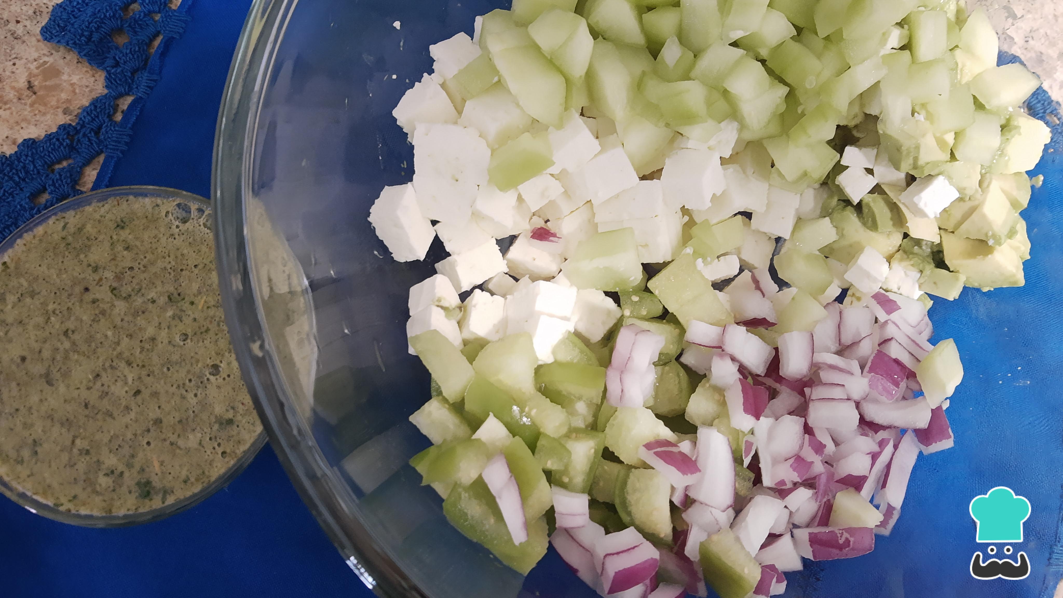 Cuando tengas todos los ingredientes picados, es momento de integrar para armar el ceviche de queso panela. En un recipiente coloca el queso, el aguacate, el pepino, la cebolla, el tomate verde y, por último, el aderezo de limón y cilantro. Mezcla todo muy bien para que se integre y todo se bañe un poco con el aderezo.