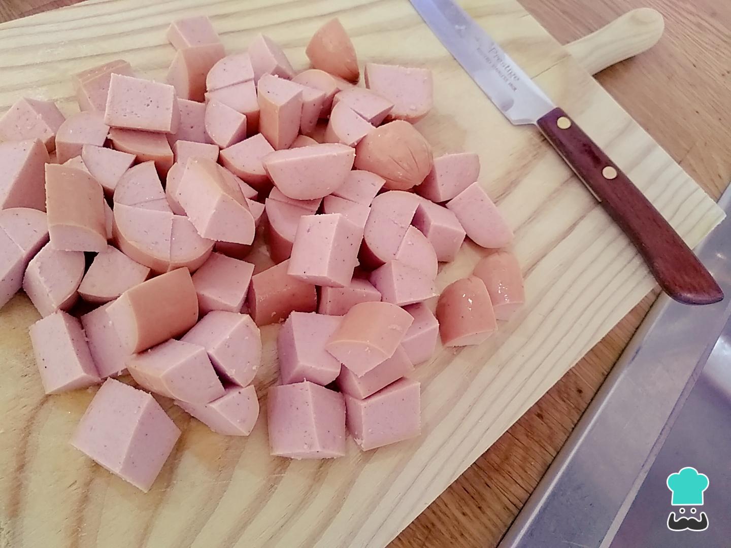 Corta las salchichas en rodajas y, después, cada rodaja en cuatro pedazos si son de las gruesas, si son salchichas más bien finas simplemente corta las rodajas por la mitad.