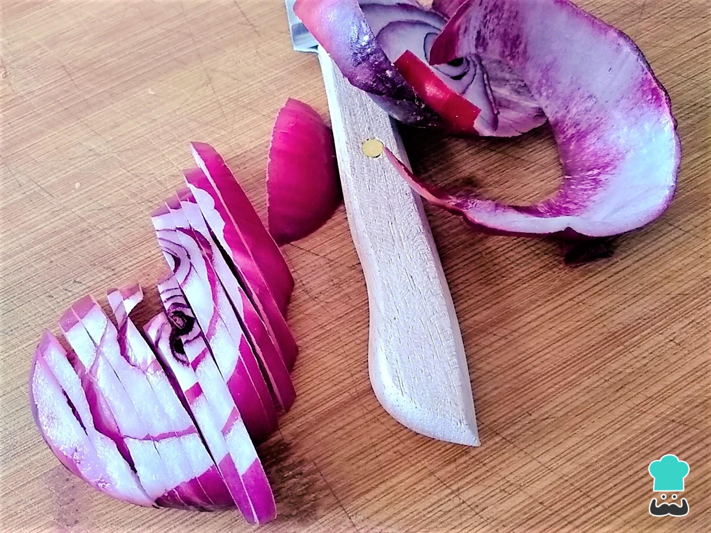 Pica la cebolla morada en trozos no muy pequeños. Para ello, córtala primero en láminas y luego por la mitad. Y si prefieres que el ceviche de salchicha quede más fino, puedes trocear los ingredientes aun más pequeños, ¡a tu gusto!