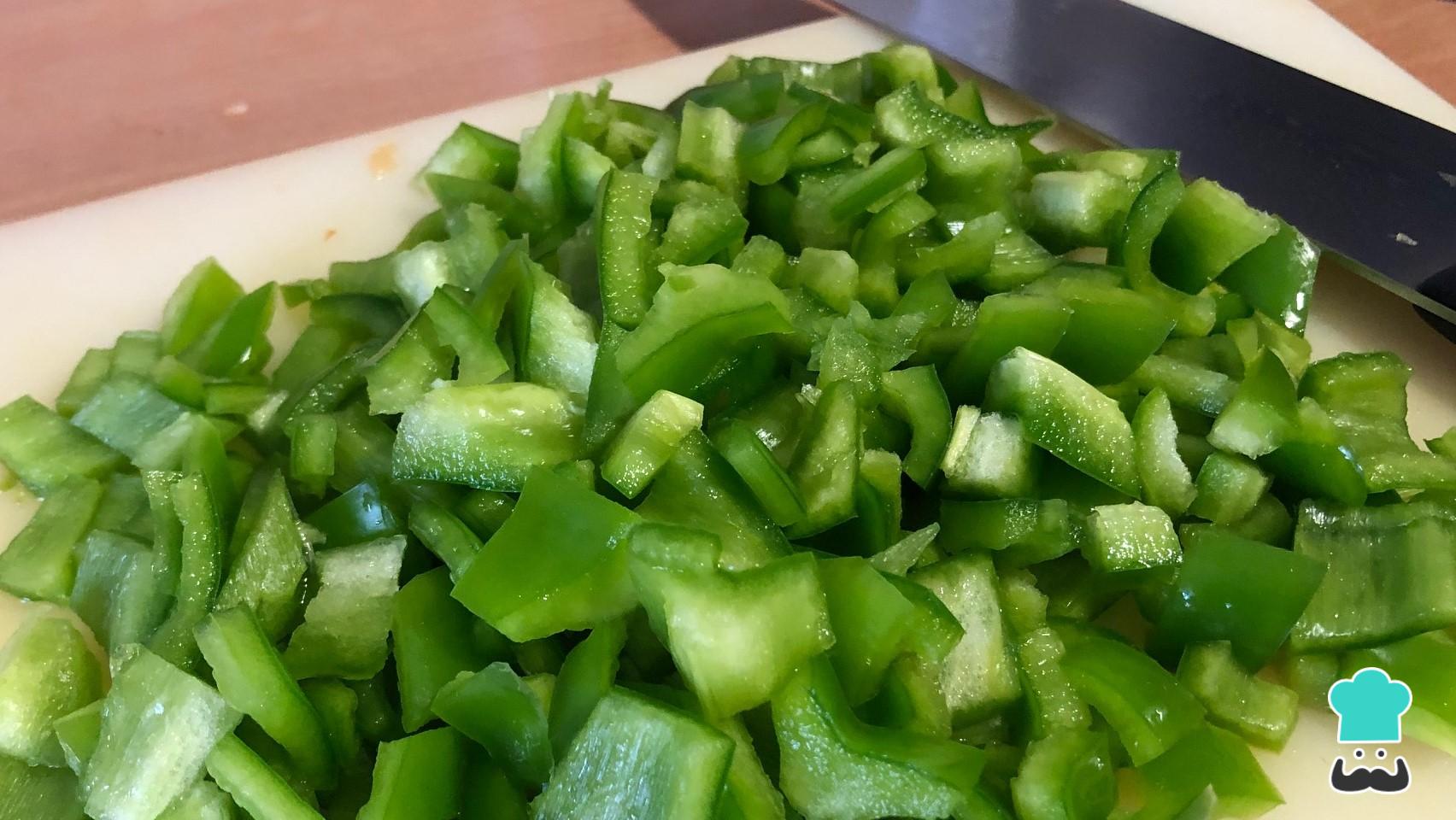 Pica también los demás ingredientes en cuadros pequeños, es decir, el pimiento verde, el pepino, el aguacate y el tomate.