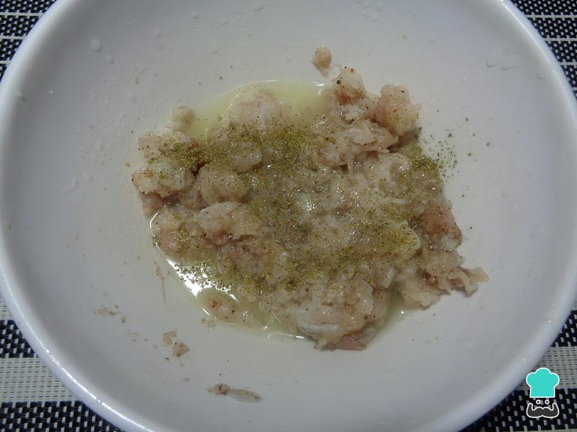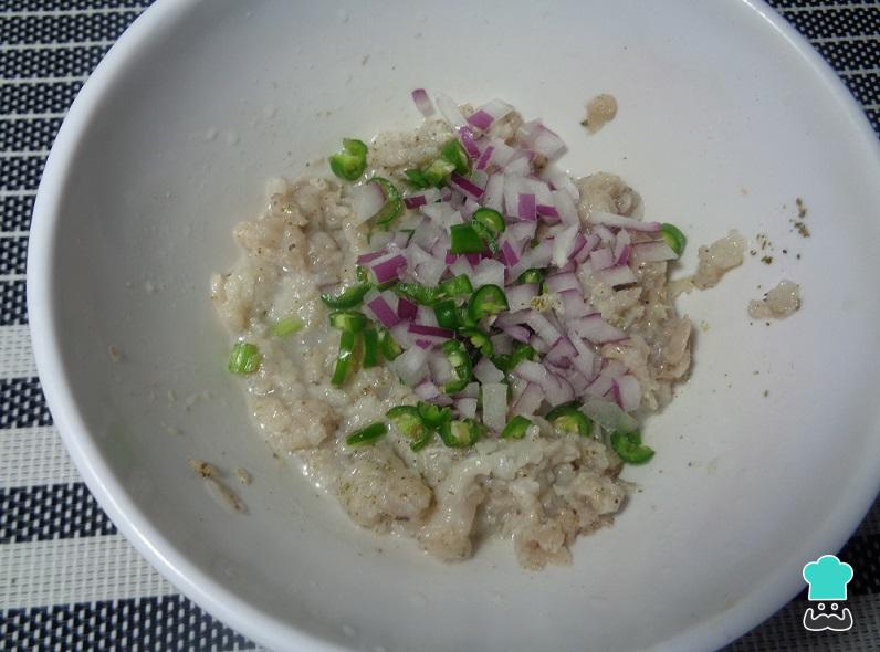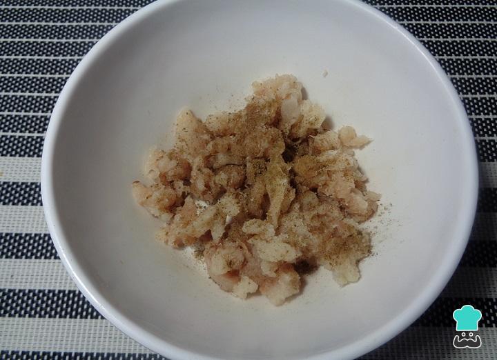 Coloca el pescado sierra molido en un tazón y añade una pizca de sal y pimienta. Luego, mezcla perfectamente hasta integrar todo.