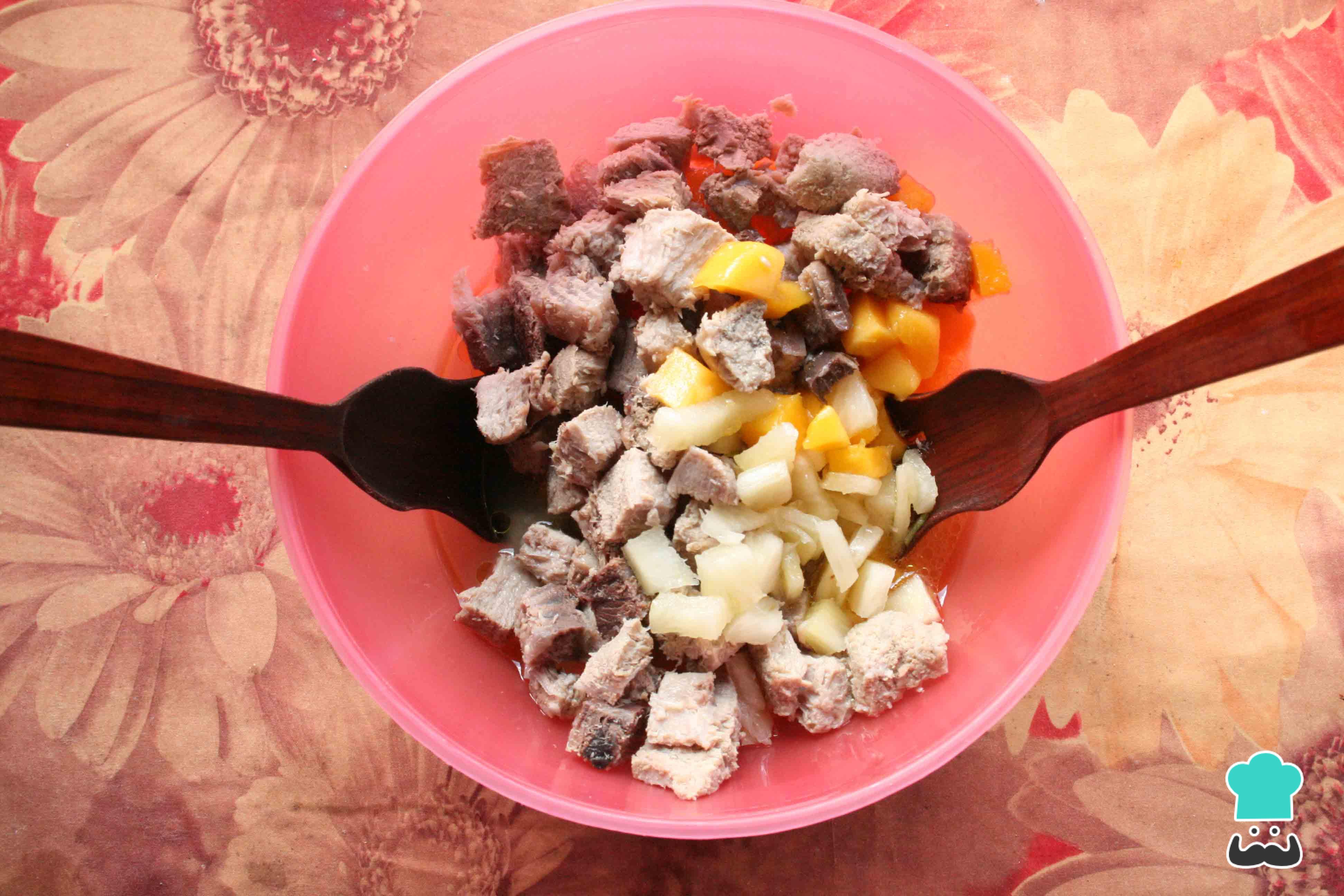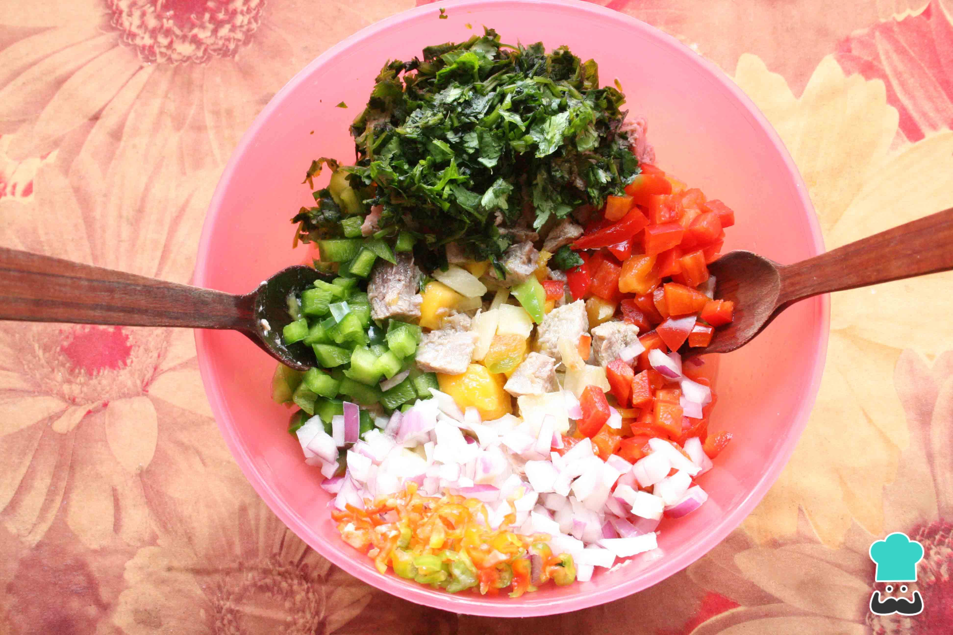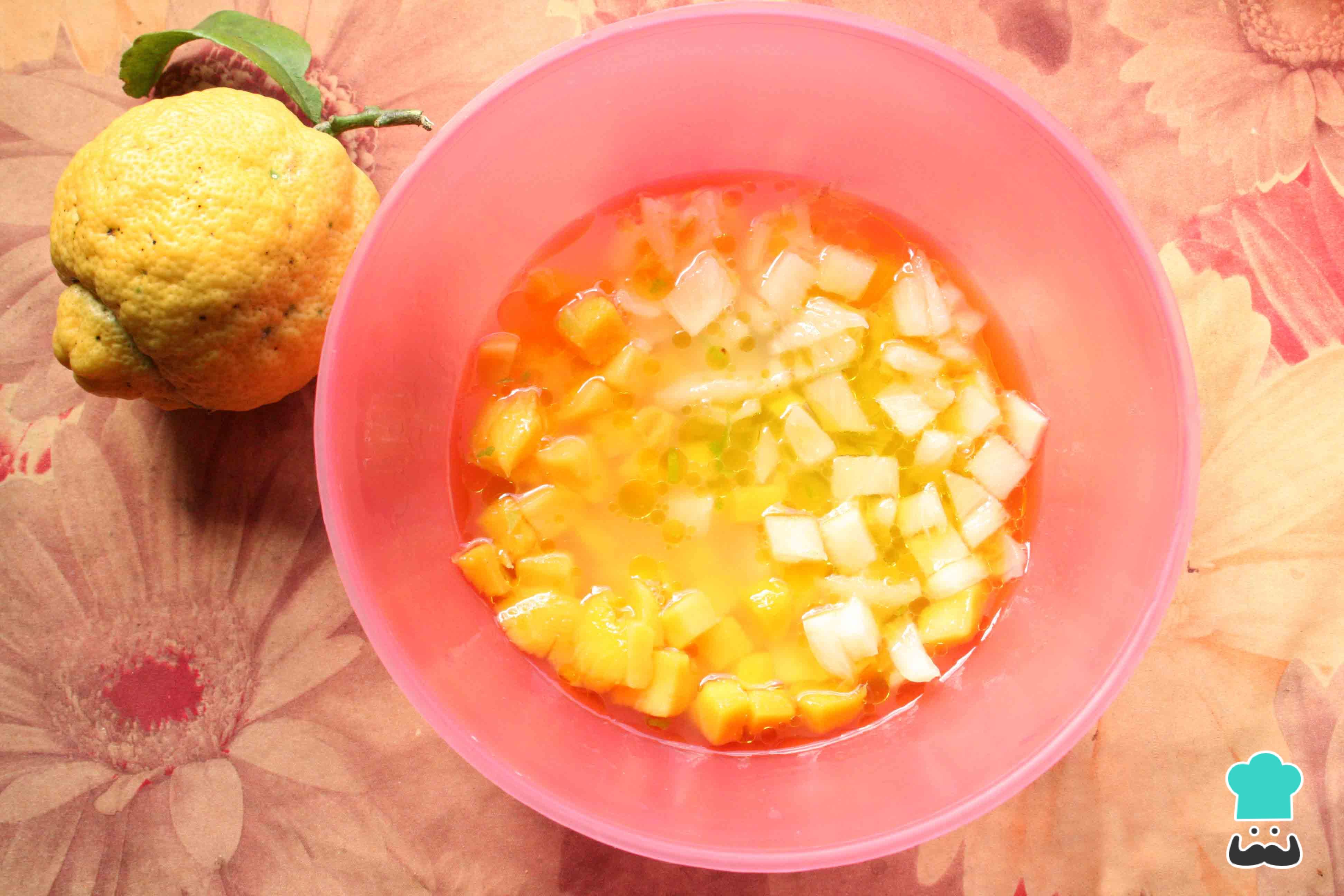Incorpora el pescado a la mezcla para seguir con la preparación del ceviche con mango y piña. Remueve con cuidado hasta integrar todo.