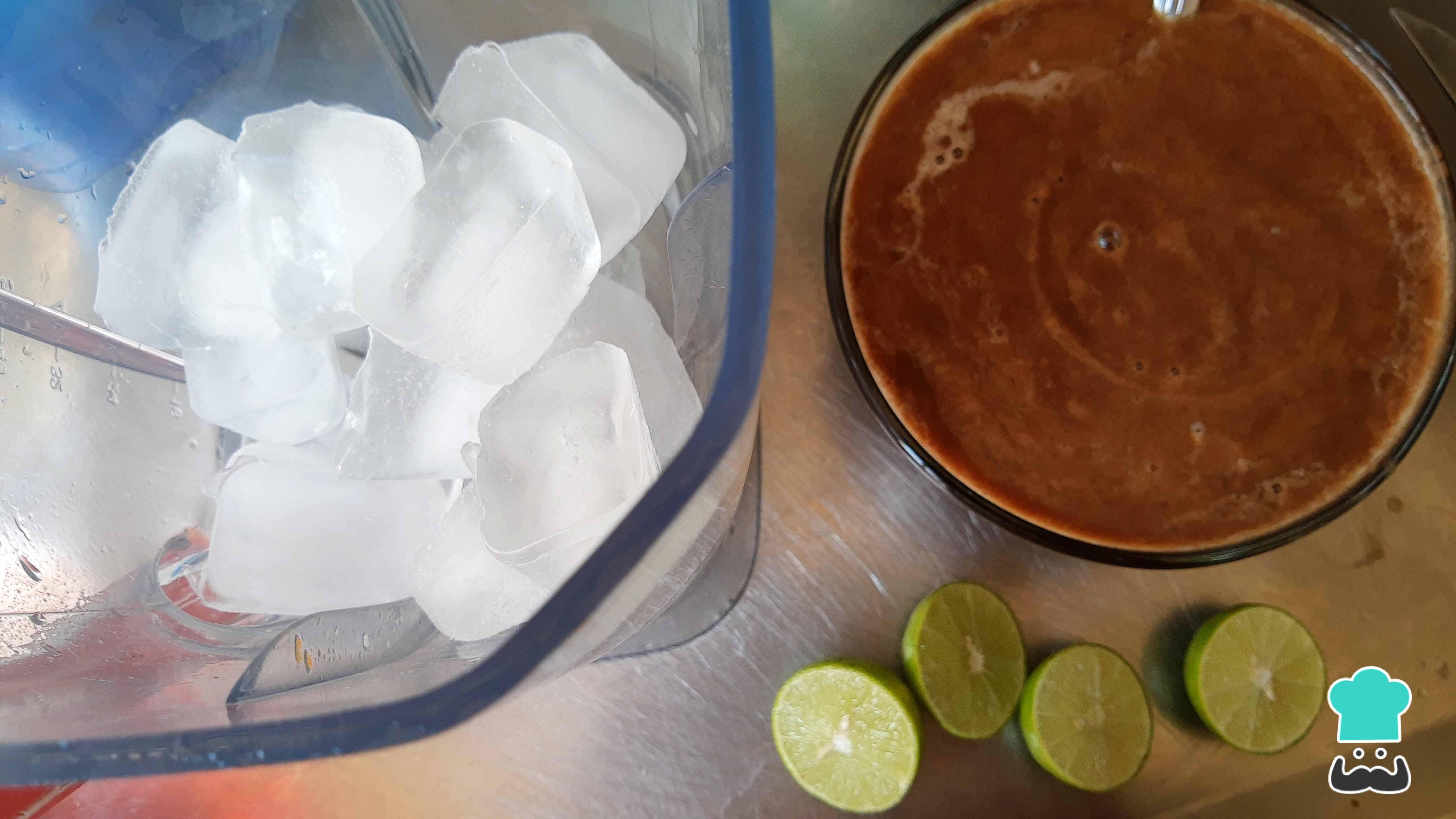 Para continuar con la receta de chamoyada de tamarindo, coloca en la licuadora hielo al gusto, el concentrado de tamarindo, el jugo de dos limones y un poco de chamoy también. Licua todo hasta que el hielo esté granizado. La cantidad de hielo dependerá de lo congelada que quieras la chamoyada.