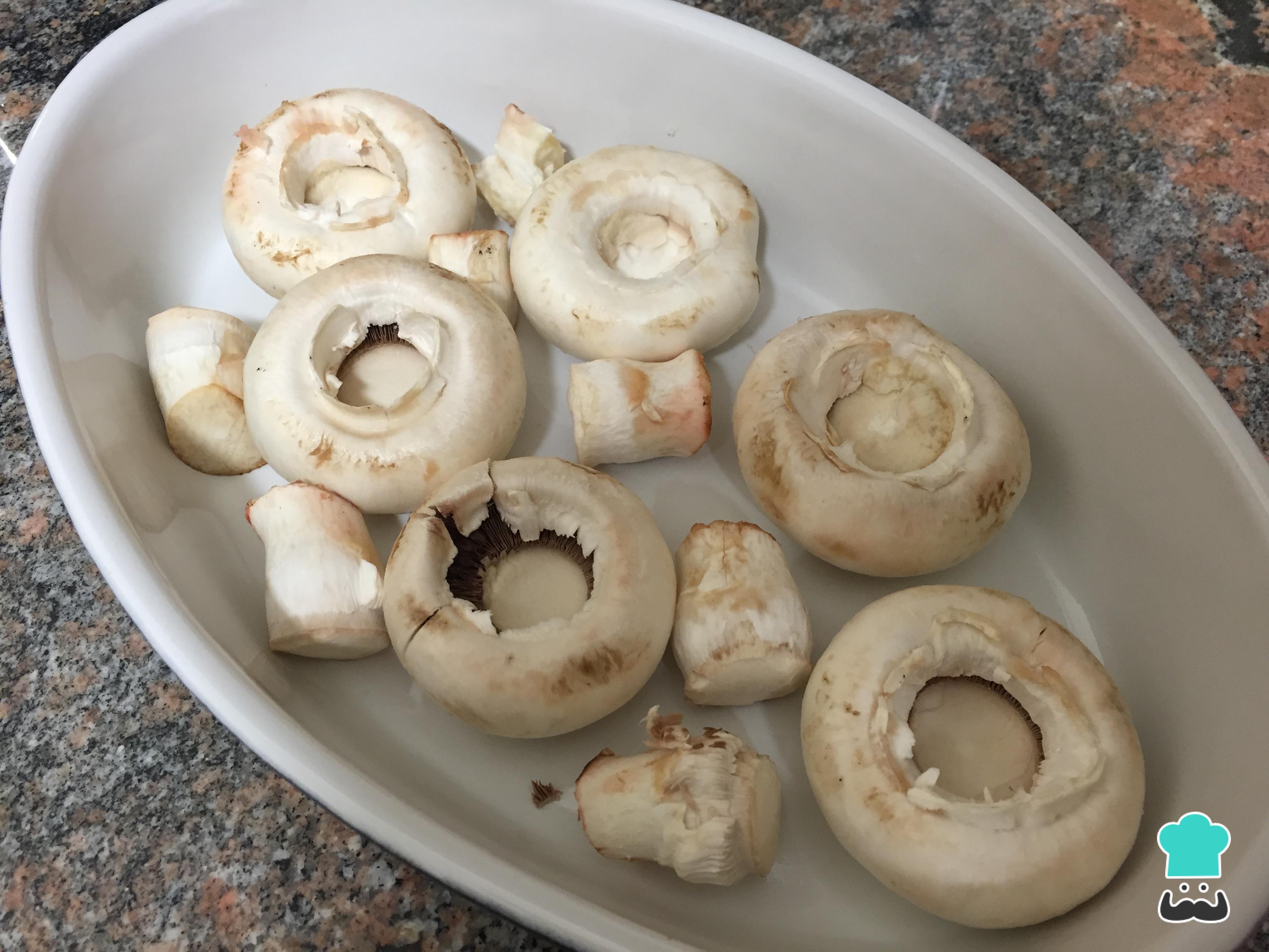 Lo primero que debes hacer para poder elaborar esta receta de setas rellenas es limpiar los champiñones y retirar el tallo con mucho cuidado. No debes cortarlo, solo tirar de él con los dedos para conseguir que salga y quede un hueco en el champiñón. Coloca los champiñones en una bandeja apta para horno.