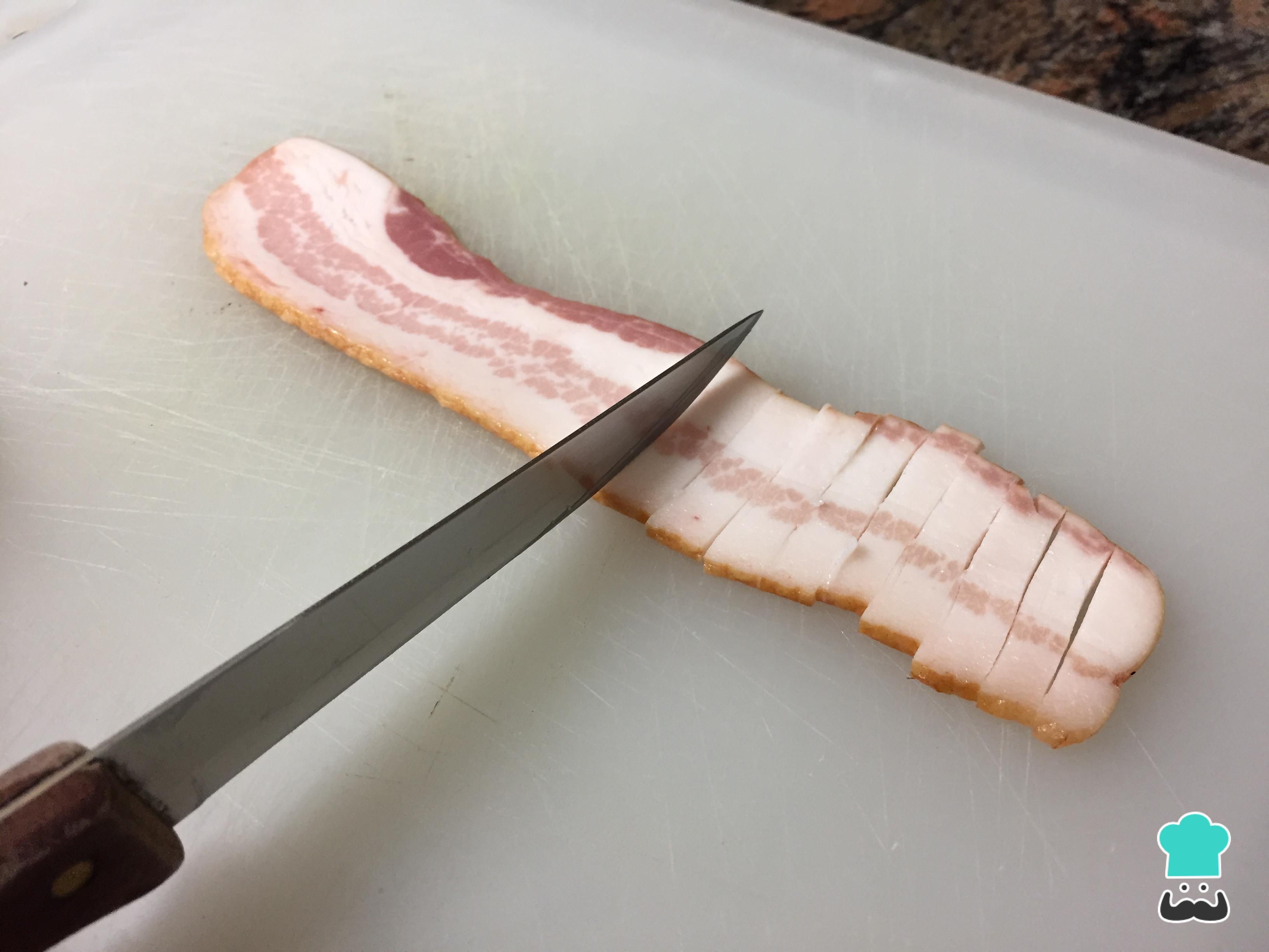 Aparte, corta el bacon en tiras finas. Para no desperdiciar los tallos que retiraste de los champiñones, puedes incluirlos también en la bandeja y hornearlos para consumirlos.