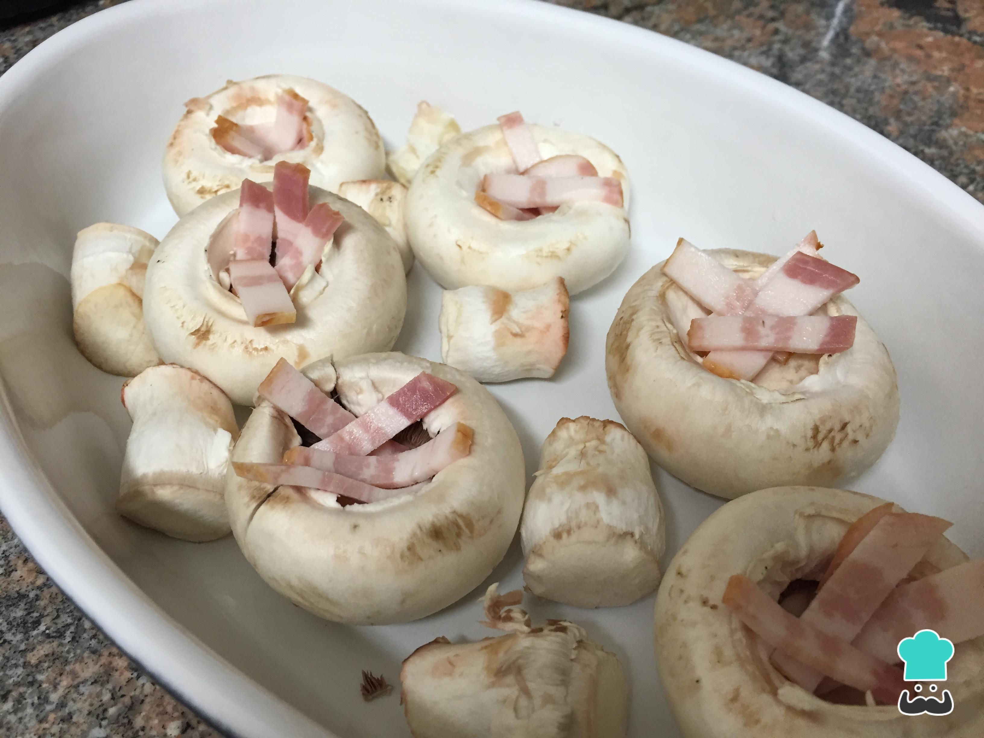 Luego, rellena cada uno de los champiñones con los trozos de tocino, de manera que todos tengan la misma cantidad.