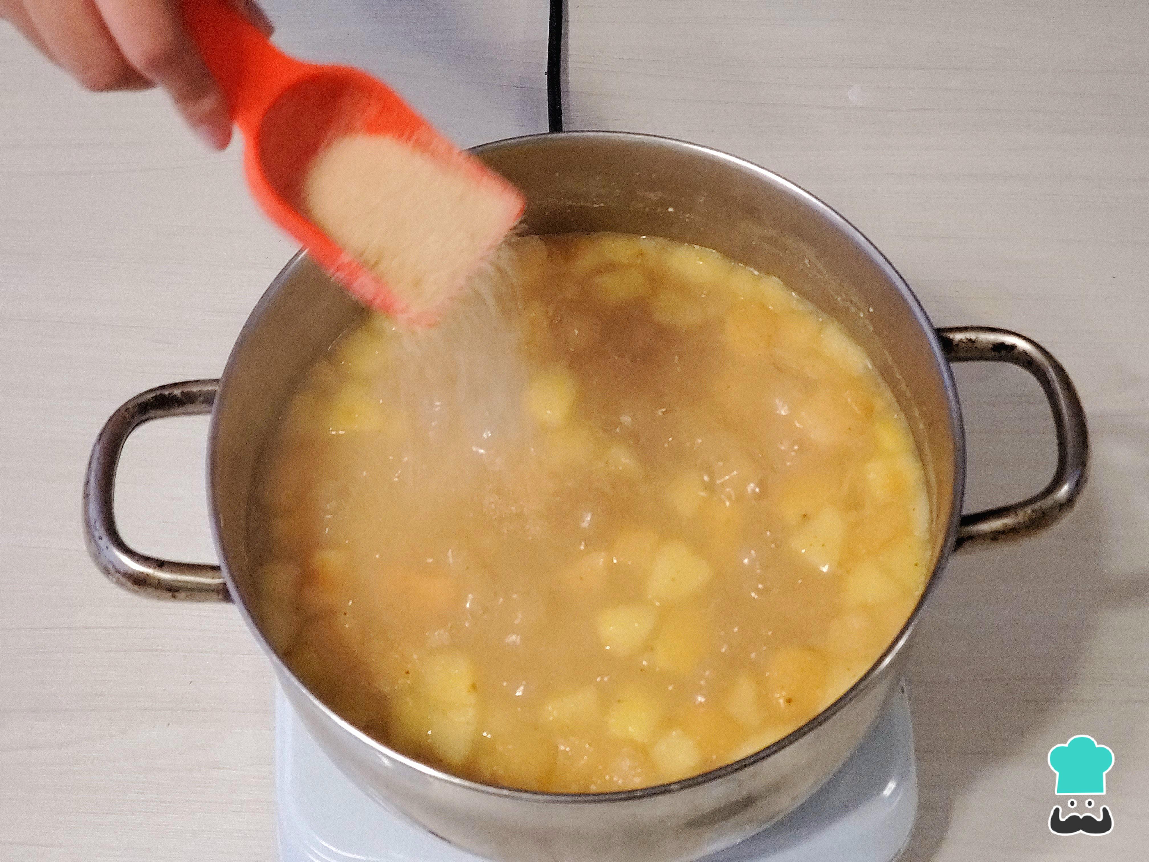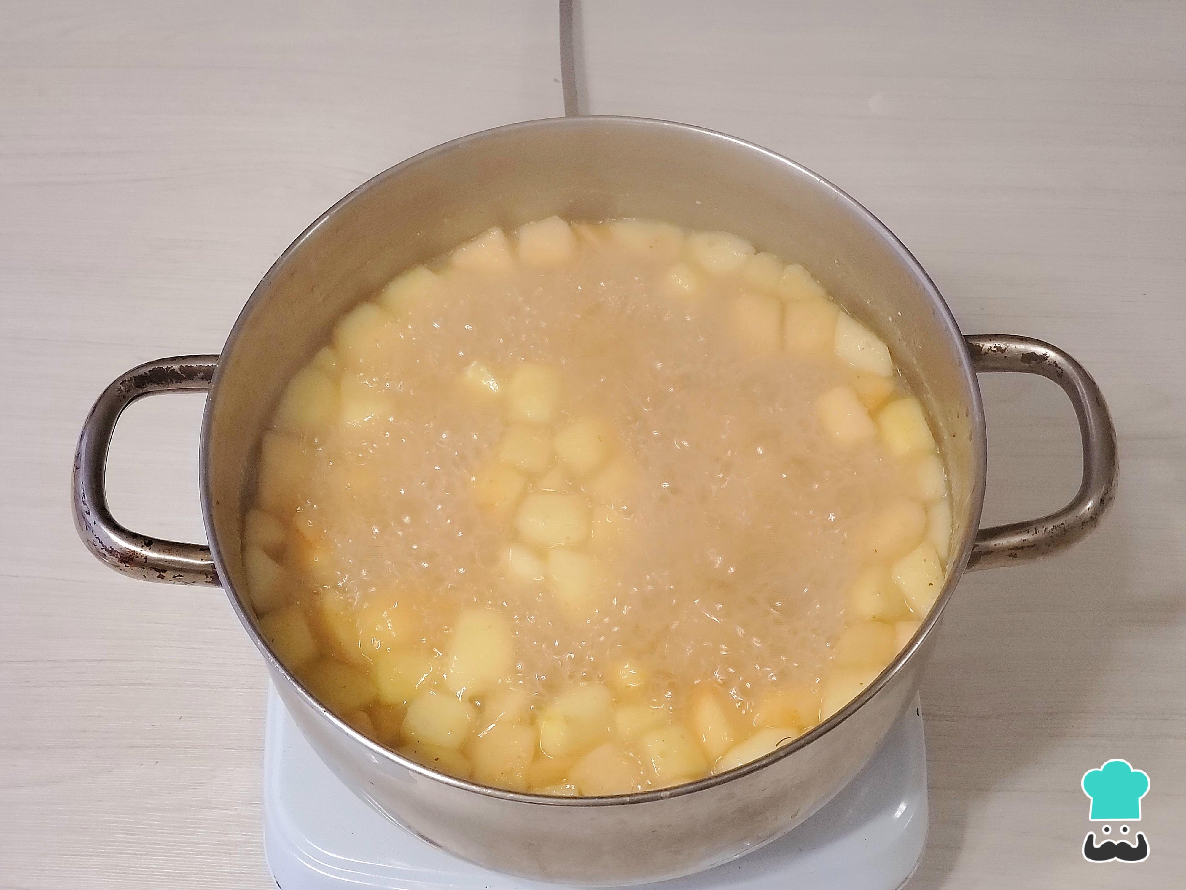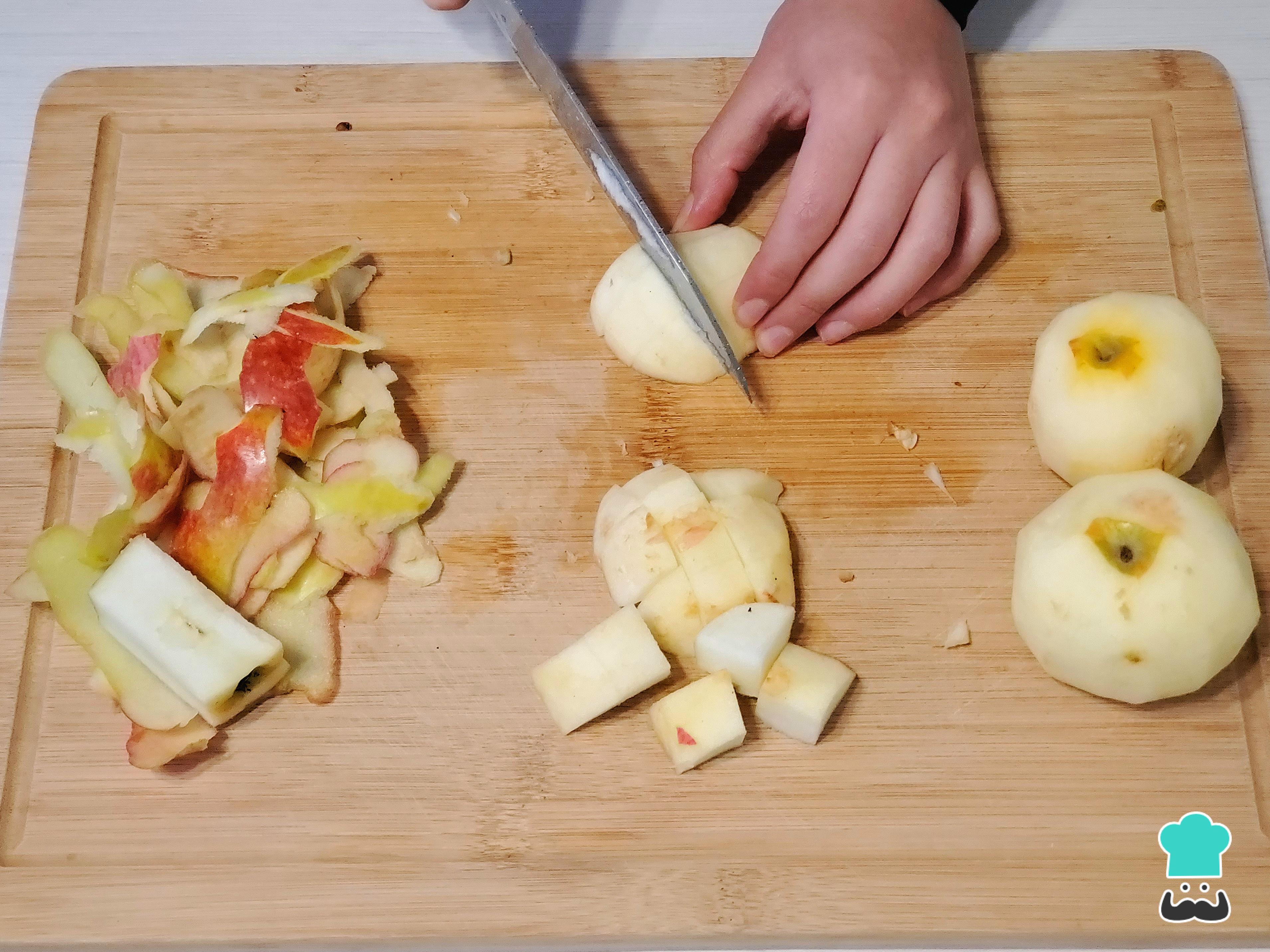 Empieza lavando y pelando las manzanas. Luego, corta los extremos, retira el corazón y corta en cubos medianos. Reserva esta pulpa en un bowl y coloca las cáscaras junto con los corazones en una olla grande.