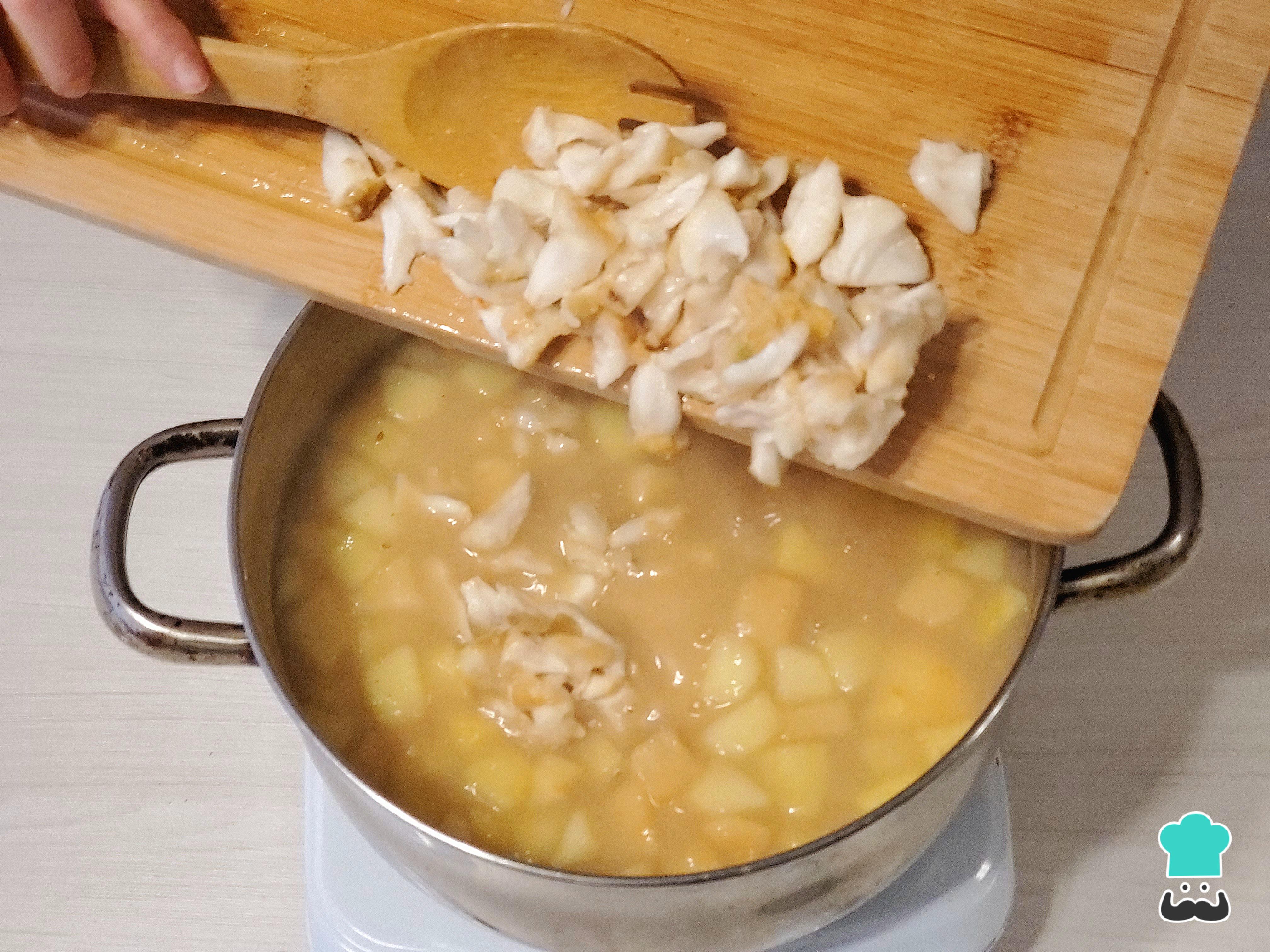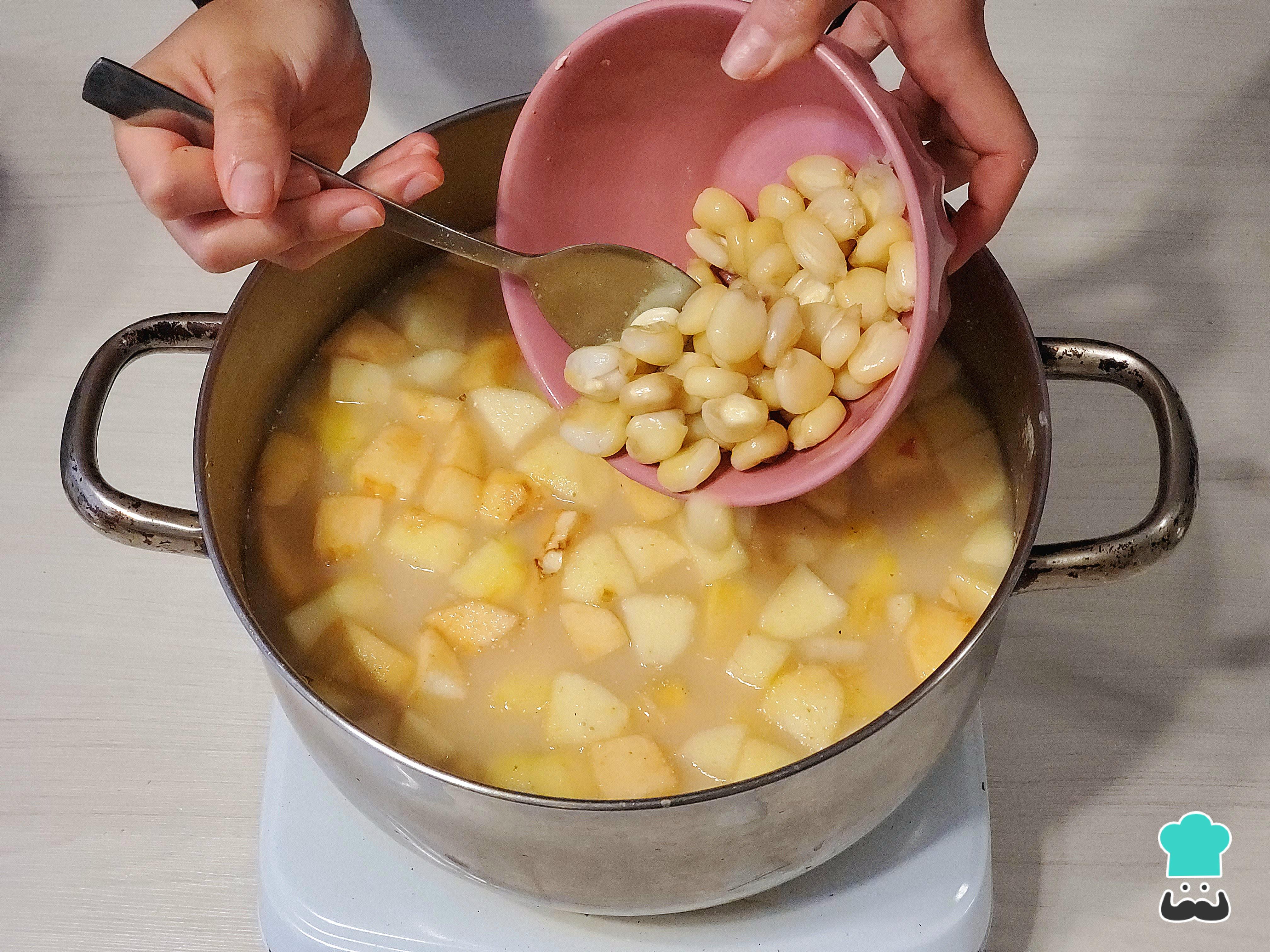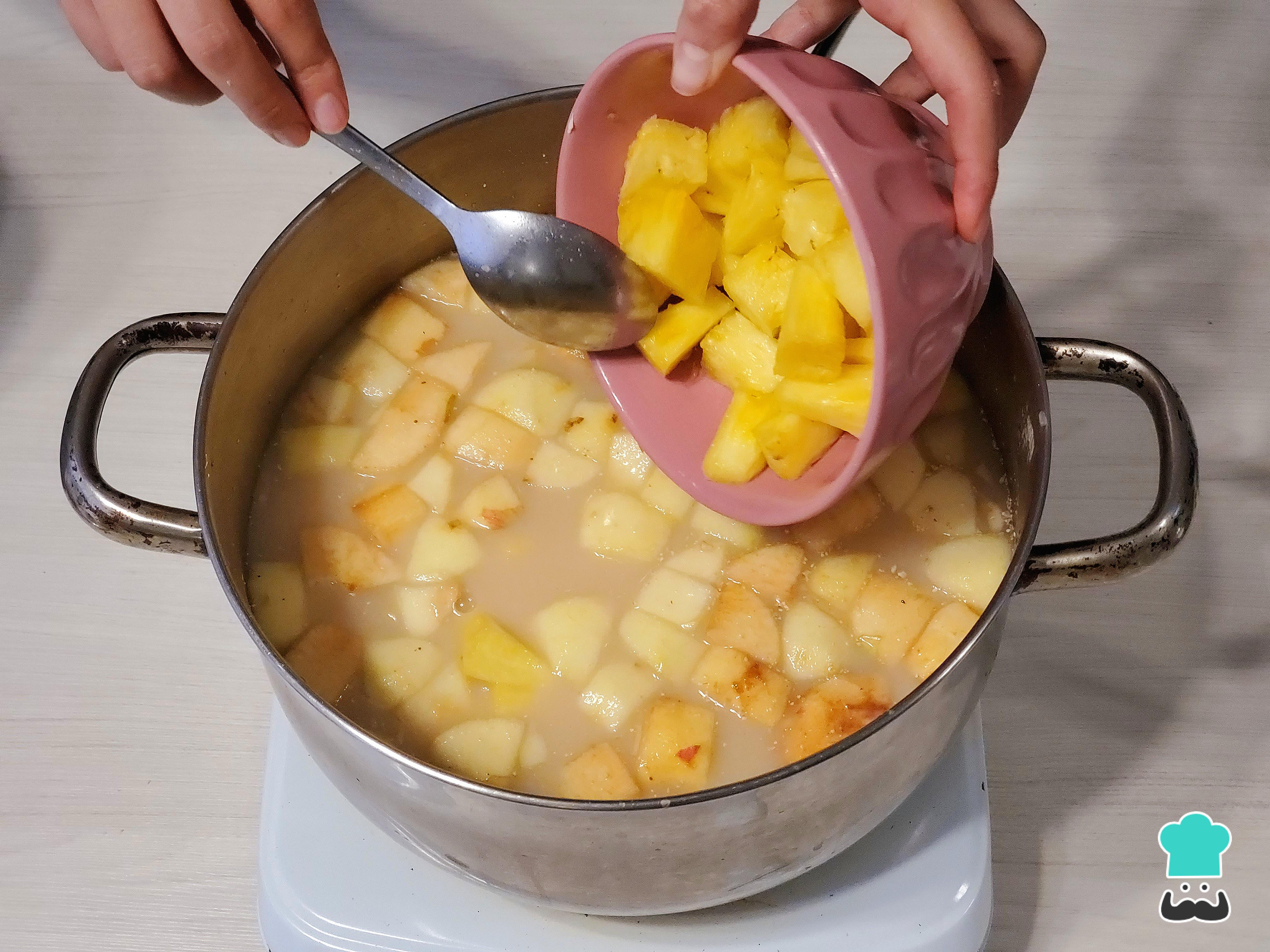 Inmediatamente, añade la fruta picada, a excepción de la guanábana. Esto incluye la piña, el membrillo y la manzana.