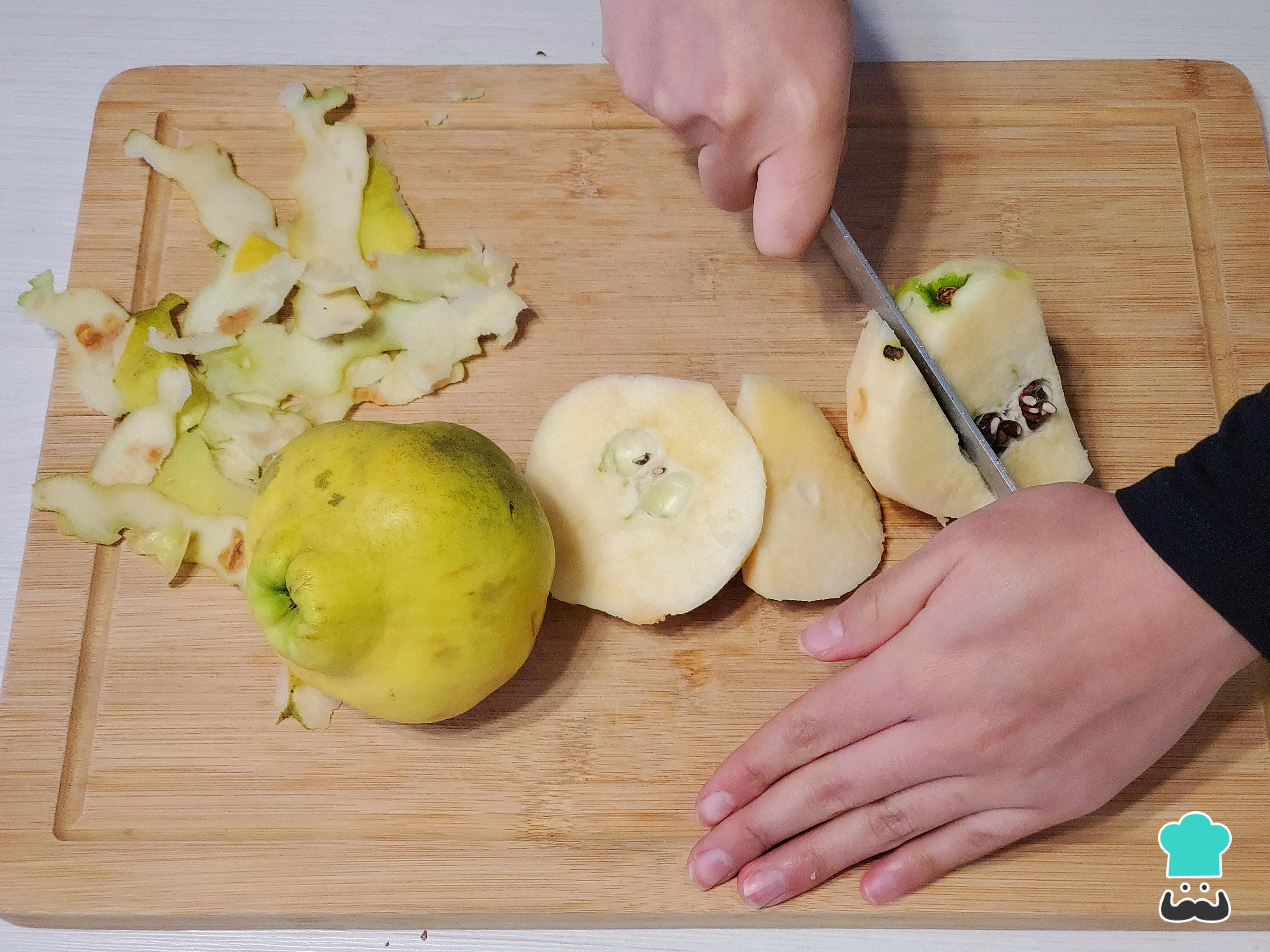 De igual manera, pica los membrillos. No olvides guardar las cáscaras y corazones en la olla.
