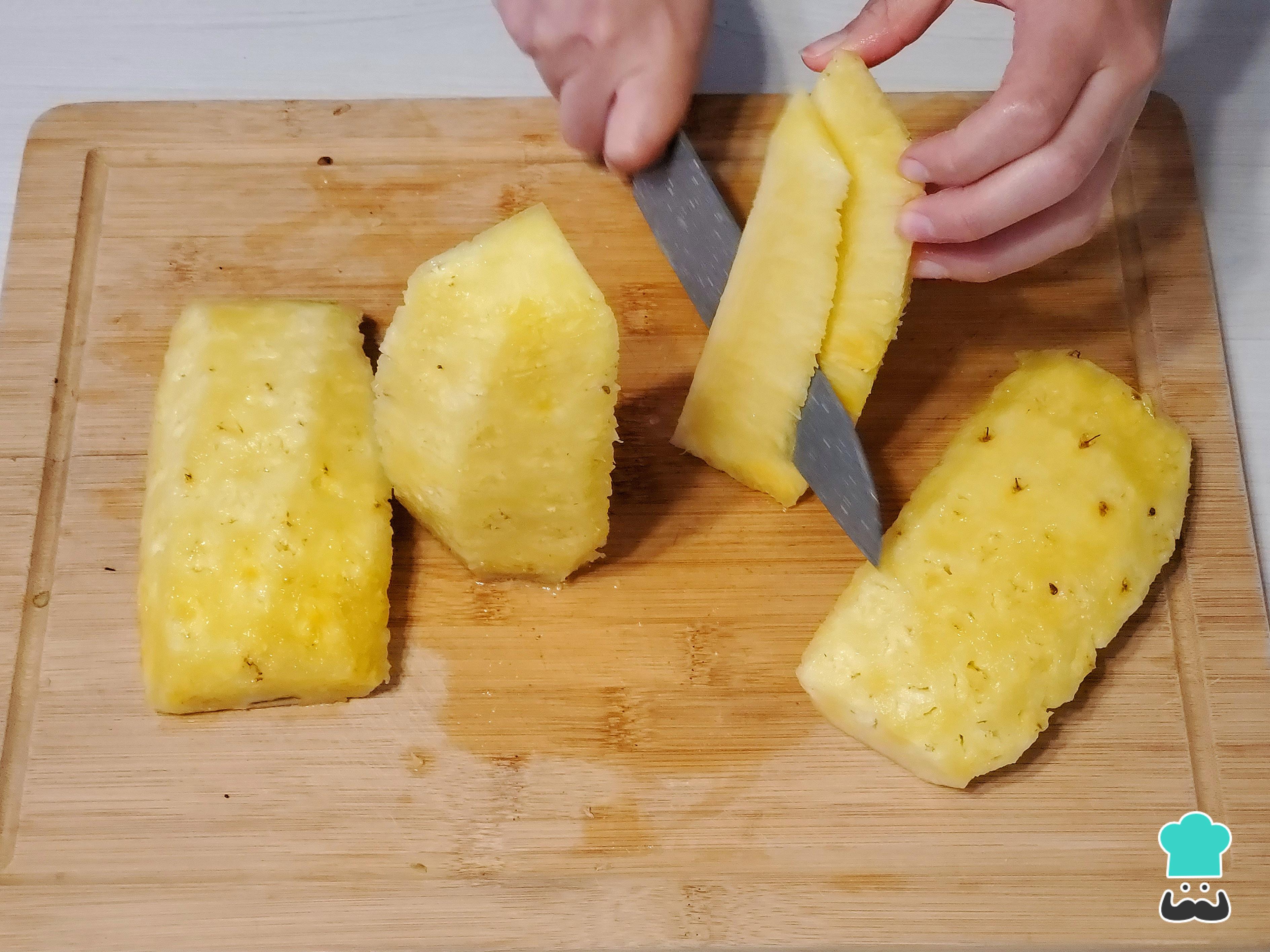 También corta la piña en trozos medianos. Para hacerlo, empieza retirando la corona, la base y la cáscara y, luego, corta la piña de forma vertical en 4 partes y procede a cortar el corazón nuevamente en sentido longitudinal. Teniendo la pulpa lista, coloca cada pieza sobre la tabla y realiza cortes de forma vertical para obtener tiras de un dedo de grosor aproximadamente. Después, pica de forma transversal y reserva esta pulpa en un bowl y las cáscaras junto con el corazón en la olla.