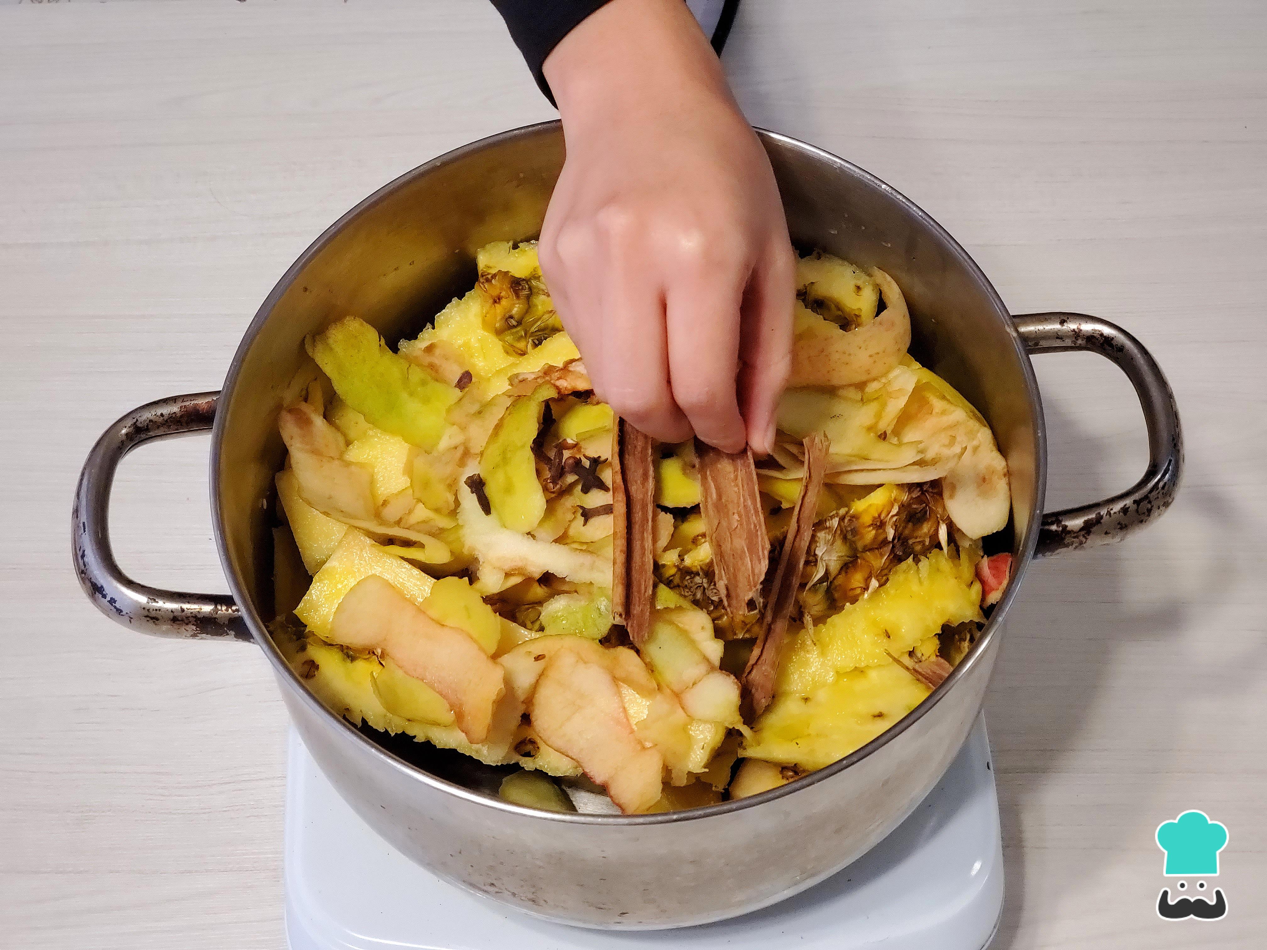A continuación, vierte en esta olla de cáscaras un par de ramas de canela, anís estrella y clavos de olor para aromatizar. Cubre con abundante agua, tapa y deja que hierva por 40 minutos aproximadamente.