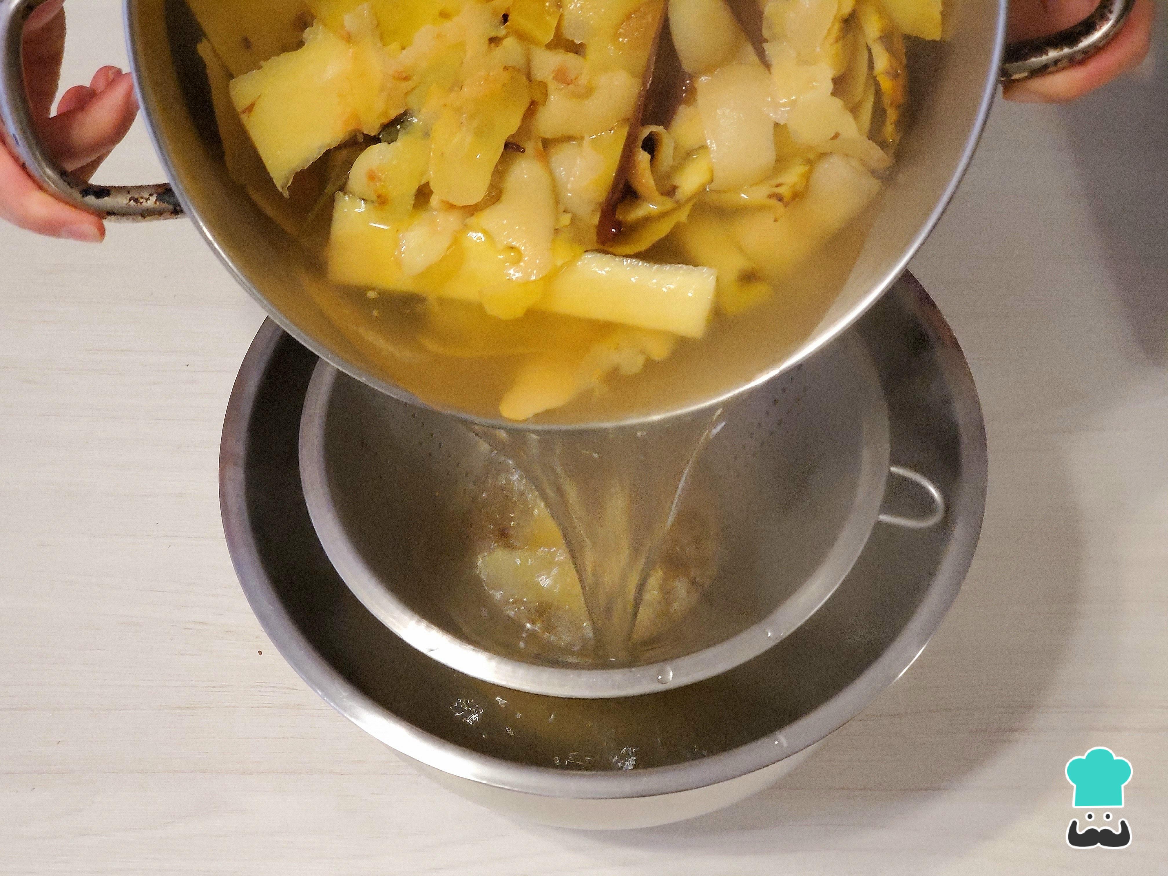 Transcurridos los 40 minutos, cuela este líquido perfumado y ahora sí puedes desechar las cáscaras. Retorna este líquido a la olla.