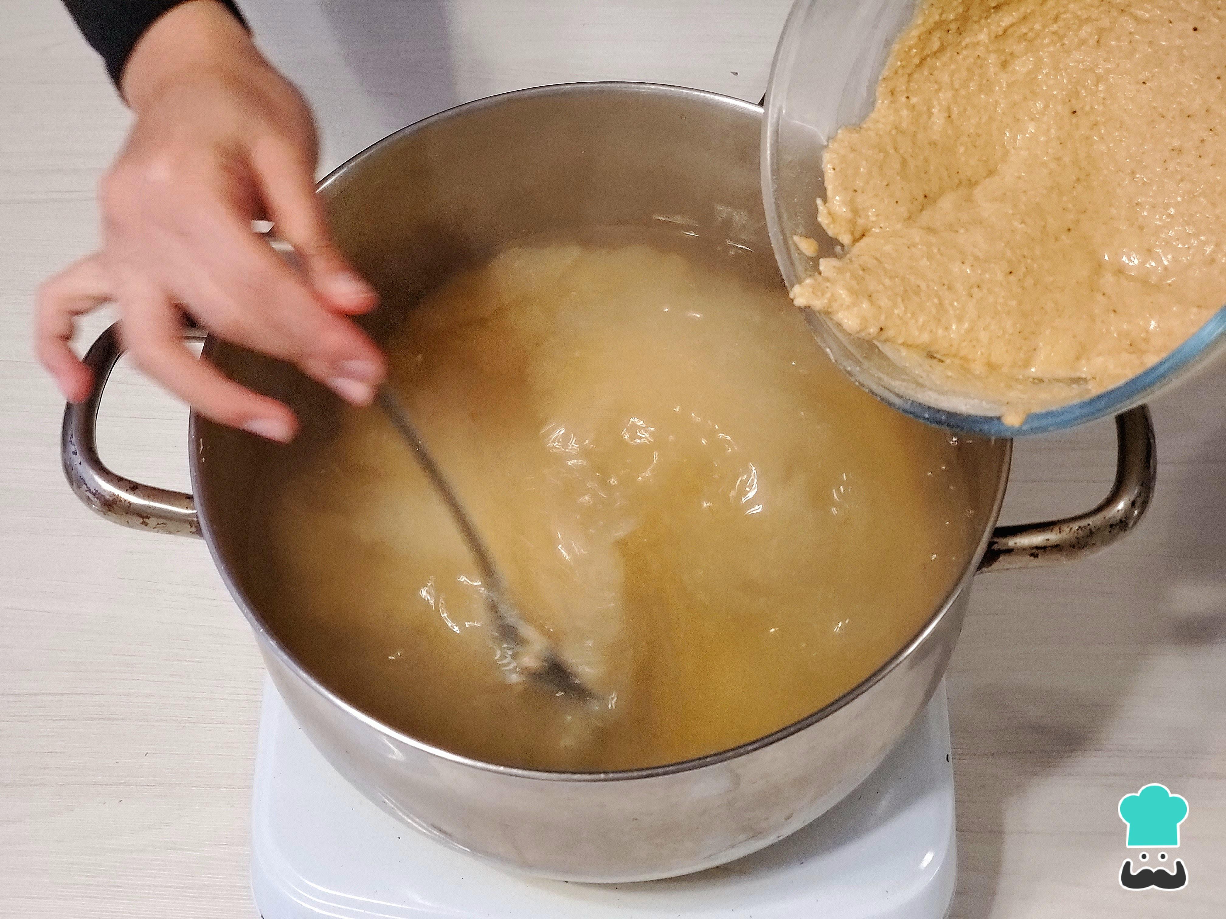 Vuelca esta mezcla en la olla y sigue removiendo para evitar que se formen grumos. A medida que toma calor, comenzará a espesar, por lo que es importante moverla constantemente.