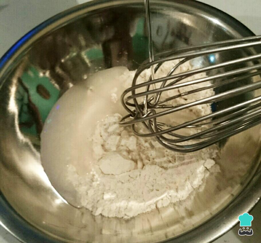 En un bowl, pon la harina de maíz y el agua fría y mezcla con ayuda de un batidor globo hasta tener una mezcla homogénea y sin grumos. Reserva.