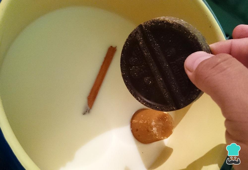 Para la elaboración de nuestro champurrado pon en una olla la leche, la rama de canela, la tablilla de chocolate, el piloncillo y lleva a hervor a fuego alto. Una vez que empiece a hervir baja a fuego medio y cerciórate de que el chocolate y el piloncillo se hayan disuelto por completo.