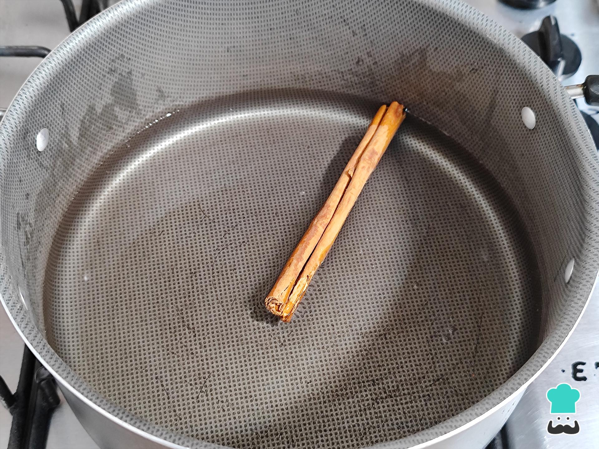 Para comenzar la receta de champurrado con maseca, hierve 3 tazas de agua con la raja de canela durante 5 a 7 minutos para extraer todo el sabor de la canela.
