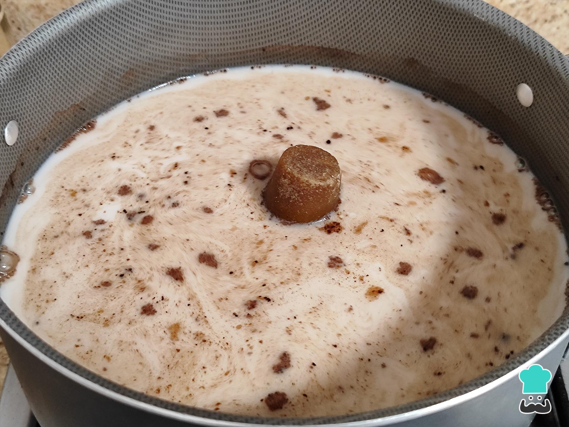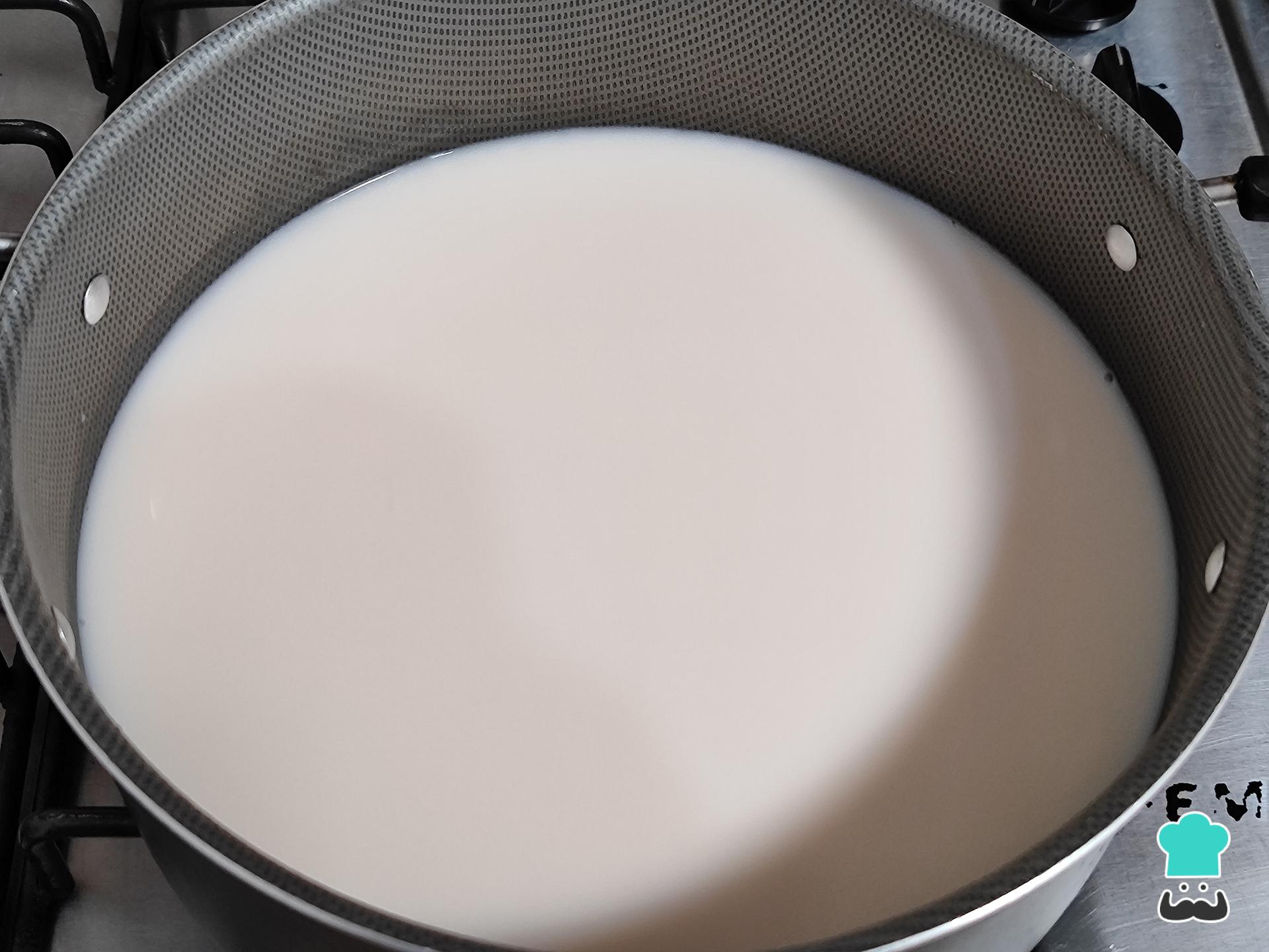 Cuando el agua con la canela empiece a hervir, añade el resto de la leche a la olla y baja el fuego al mínimo. Deja que se caliente nuevamente todo.