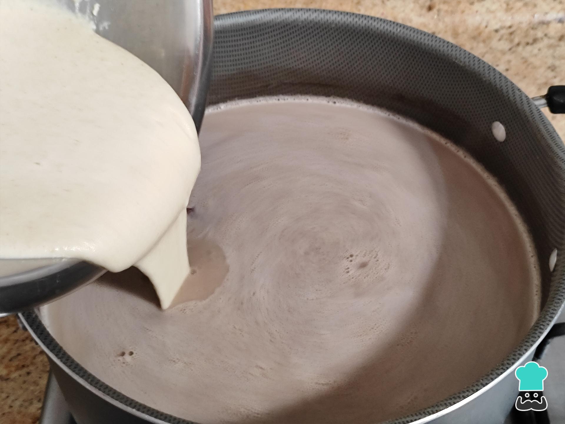 Cuando los ingredientes estén integrados a la leche, incorpora la maseca disuelta lentamente en la olla mientras remueves para evitar grumos. Cocina a fuego medio bajo por 10 a 15 minutos hasta que hierva por completo.