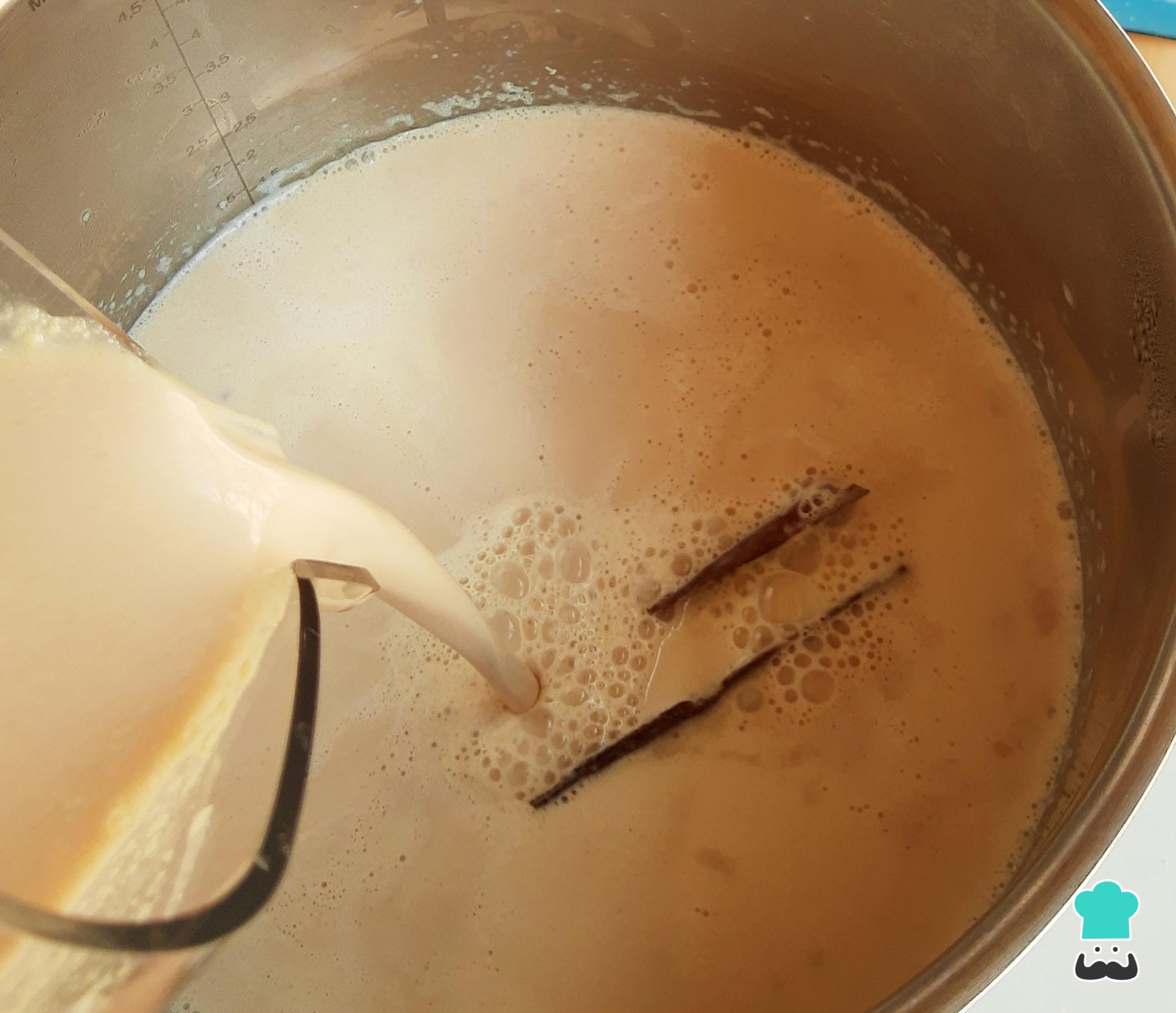 Pon la leche, la canela y el piloncillo a calentar y mueve constantemente para que se disuelva fácil el piloncillo.
