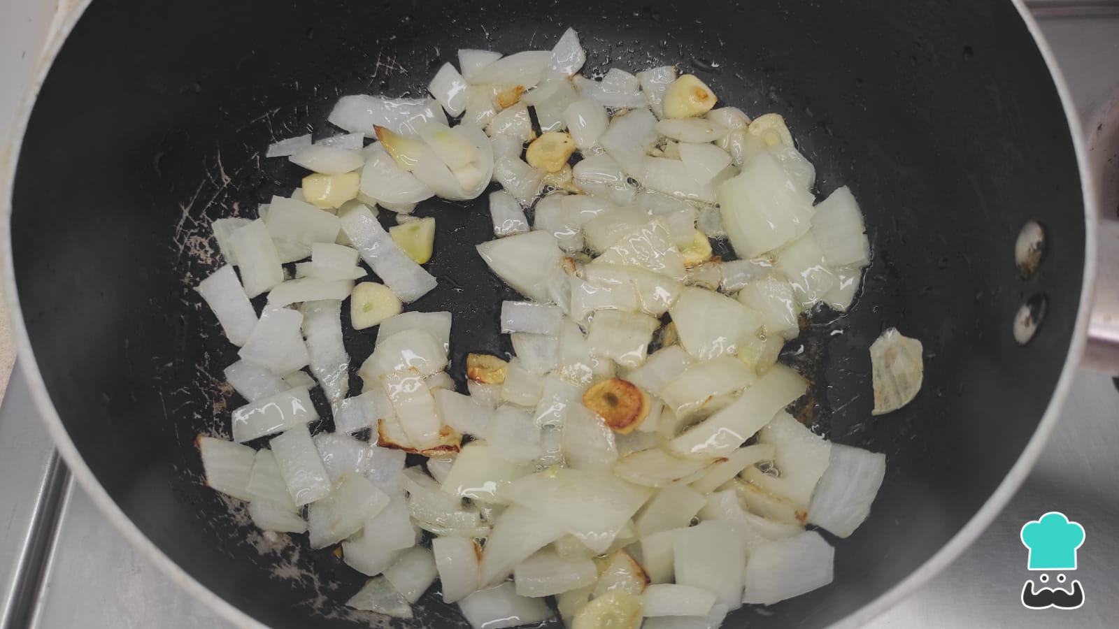 Calienta el aceite en una cacerola y sofríe la cebolla con el ajo durante unos segundos hasta ablandar.