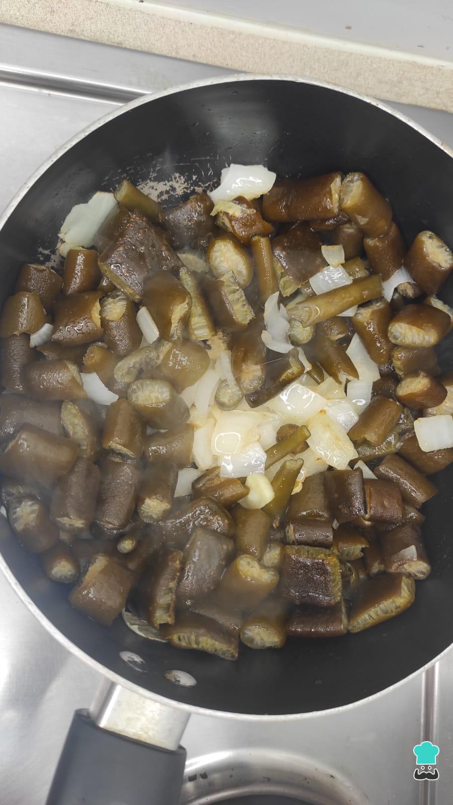 Agrega el cochayuyo previamente picado, lavado y escurrido, deja cocinar durante 4 minutos a fuego medio y revolviendo constantemente para que no se queme.