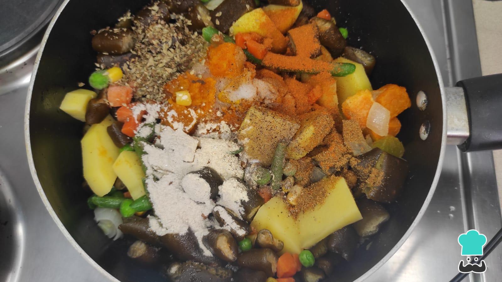 Agrega agua solamente hasta cubrir ligeramente. Cocina nuevamente a fuego medio y olla tapada durante 25 minutos aproximadamente, o hasta que los ingredientes estén bien cocidos y el agua se haya evaporado en su mayoría.