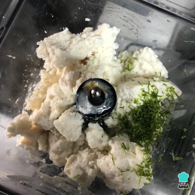 Colocar los ingredientes en la licuadora o batidora eléctrica en este orden: la leche condensada, las yemas, la leche de coco, el almidón de maíz, el azúcar moreno, el queso ricotta picado y la ralladura de limón. Batir bien hasta que quede una crema suave y homogénea. Reserva.
