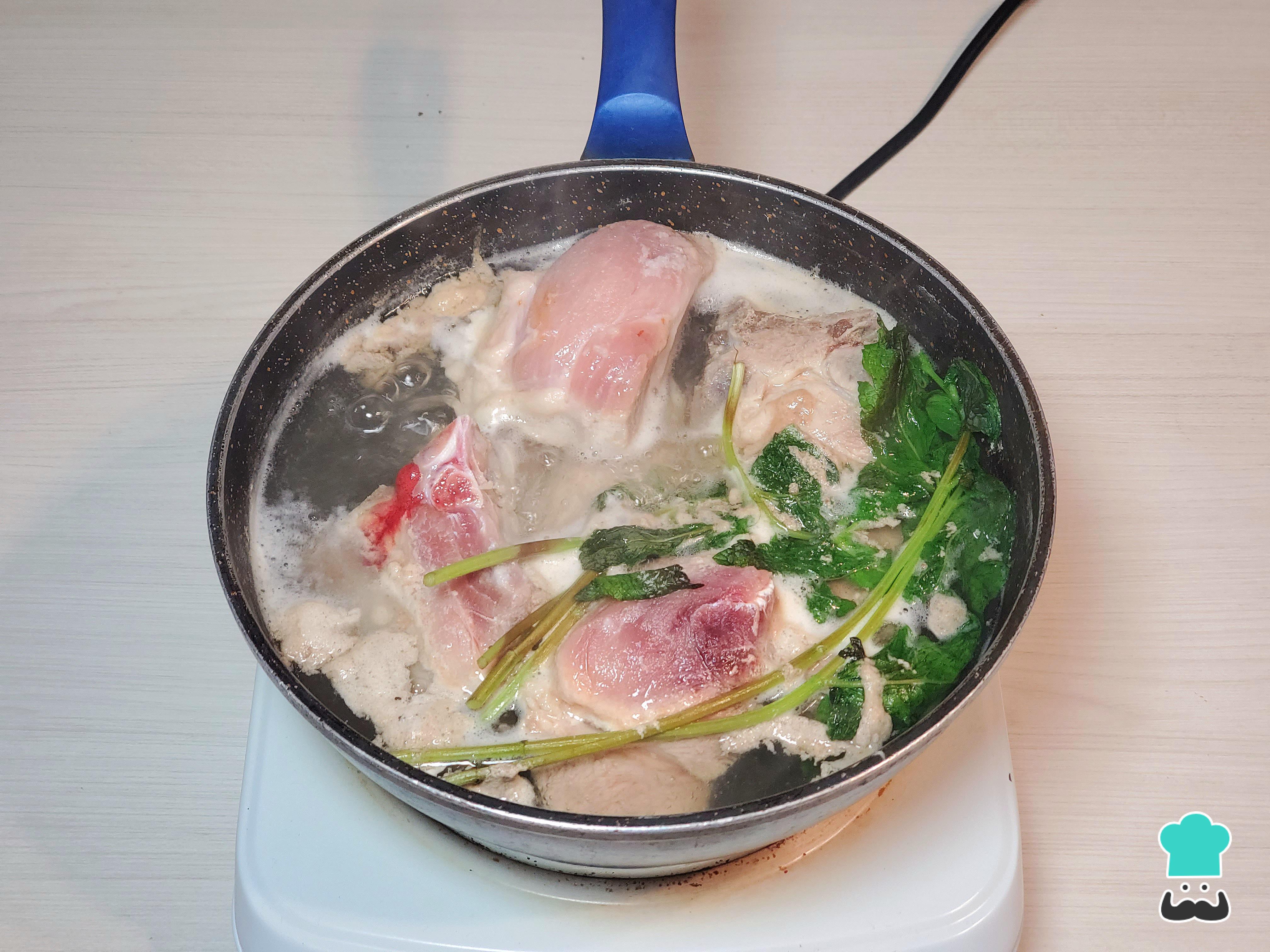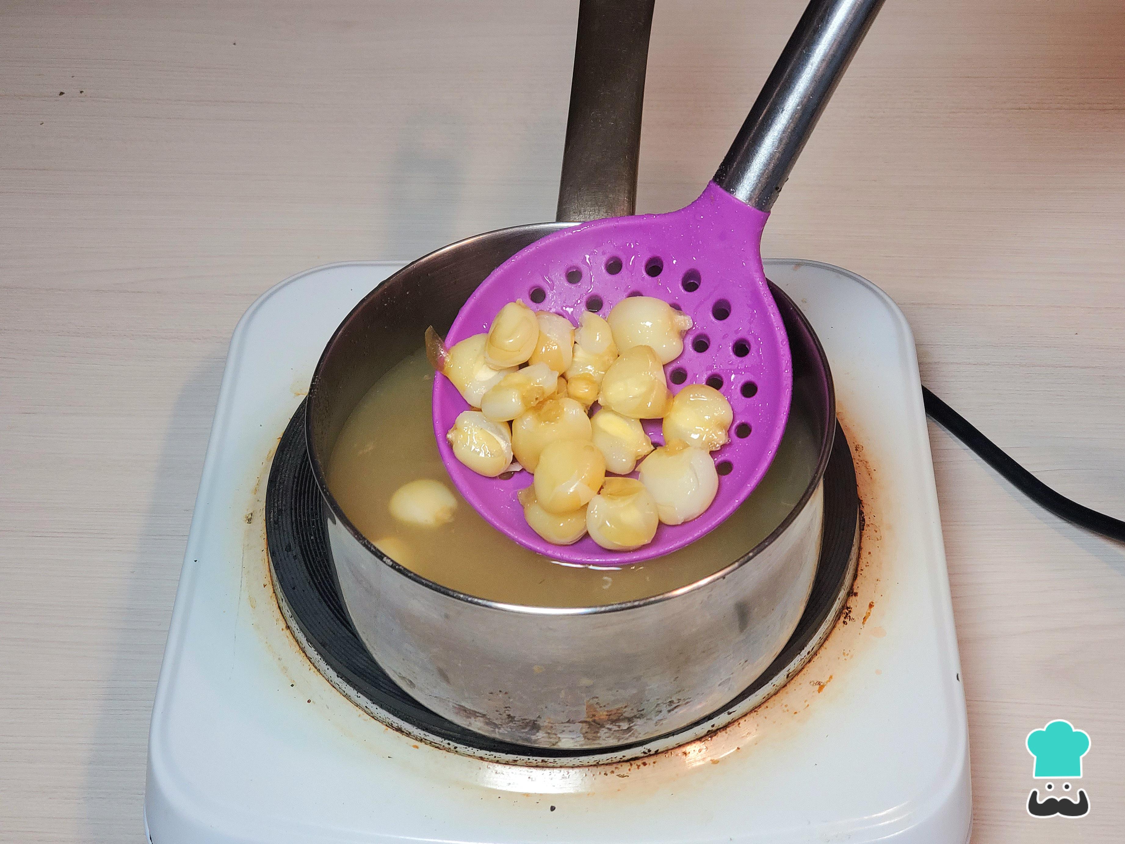 Empieza preparando el mote. Para ello, déjalo remojando en agua durante toda la noche. Al día siguiente, cocina el mote en una olla a presión para que la cocción sea más rápida, dejándolo hervir durante unos 40 minutos a 1 hora hasta que revienten y estén suave. Reserva.