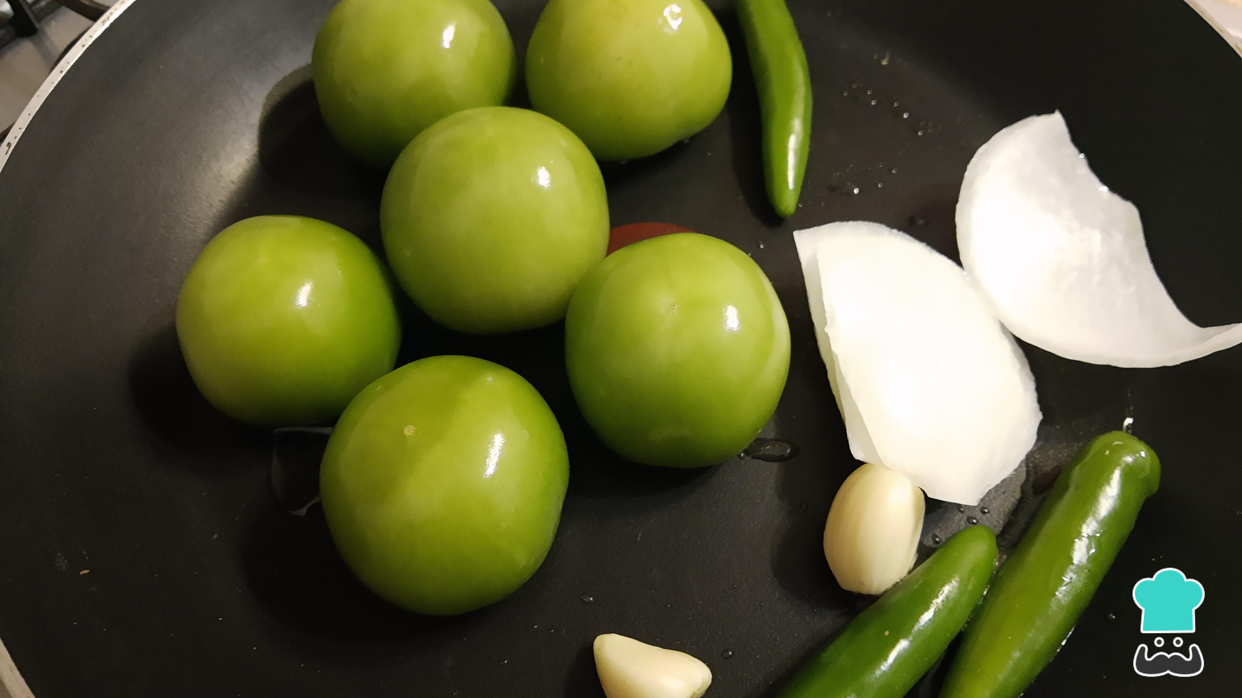 Para comenzar la receta de chilaquiles con verduras, primero prepara la salsa. Para ello, en una sartén o comal caliente pon a tatemar los tomates verdes, los chiles, el trozo de cebolla y los dientes de ajo. Proporcionala vuelta constantemente para que no se quemen de más y, si lo prefieres, puedes freírlos en aceite o con manteca de cerdo, esto es completamente opcional.