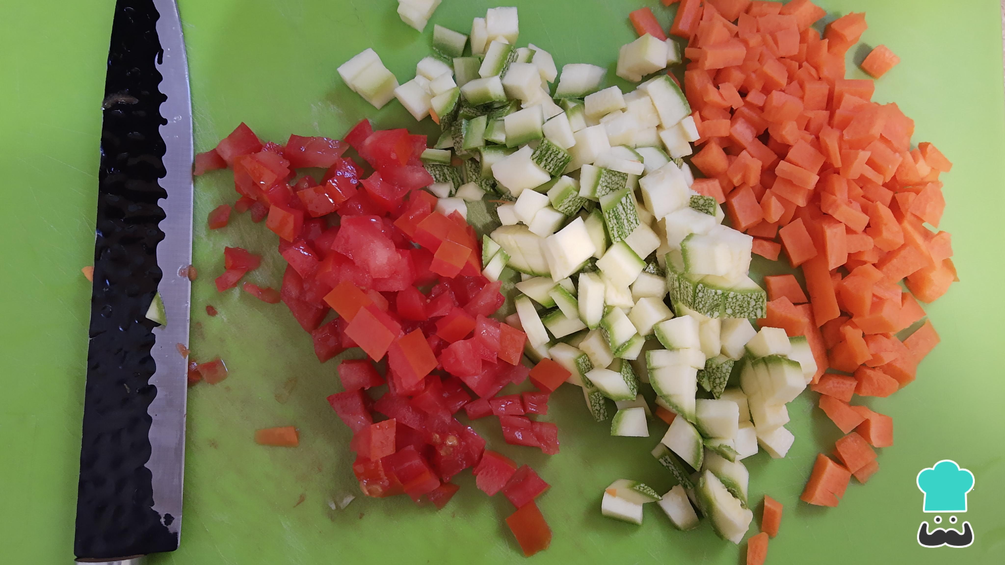 Para las verduras, primero pica en cubos pequeños la calabacita y la zanahoria y el jitomate. Puedes rallar la zanahoria y calabaza o puedes cortar todo en tiras delgadas, elige la forma que más te guste.