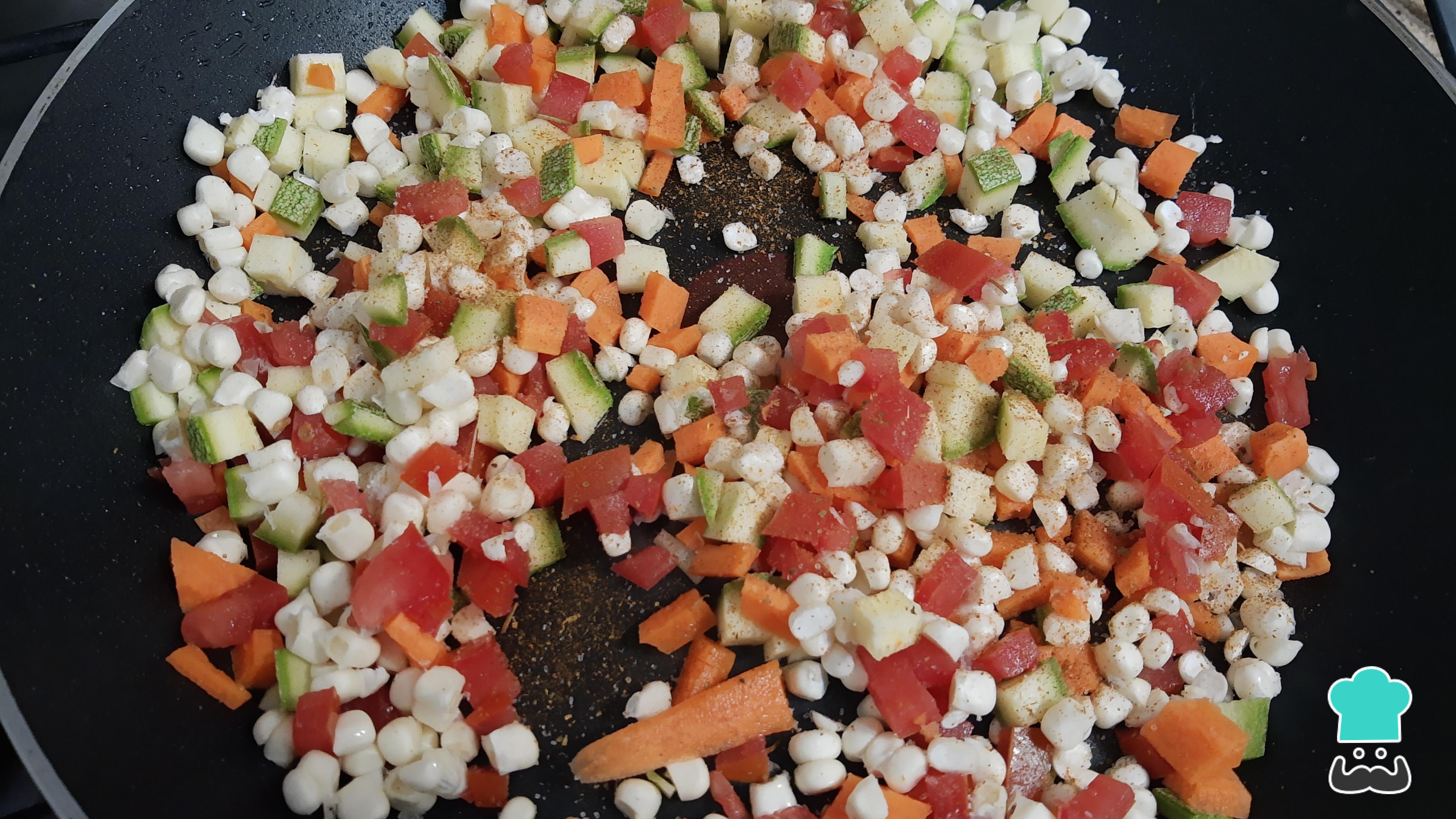 En una sartén u olla calienta una cucharada de aceite y, enseguida, agrega las verduras picadas incluyendo el elote desgranado. Agrega sal al gusto y cocina por unos 8 a 10 minutos. Puedes añadir especias para sazonar las verduras como pimienta limón, paprika, orégano o tomillo.