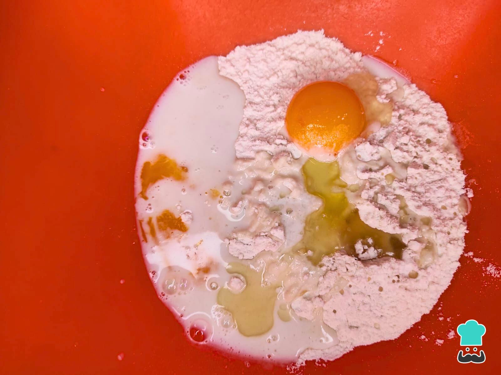 Para comenzar con las tapas de los chilenitos, en un bowl añade la harina, yemas, vinagre, leche y mantequilla derretida o aceite dependiendo de qué ocupes. En este caso usamos aceite.