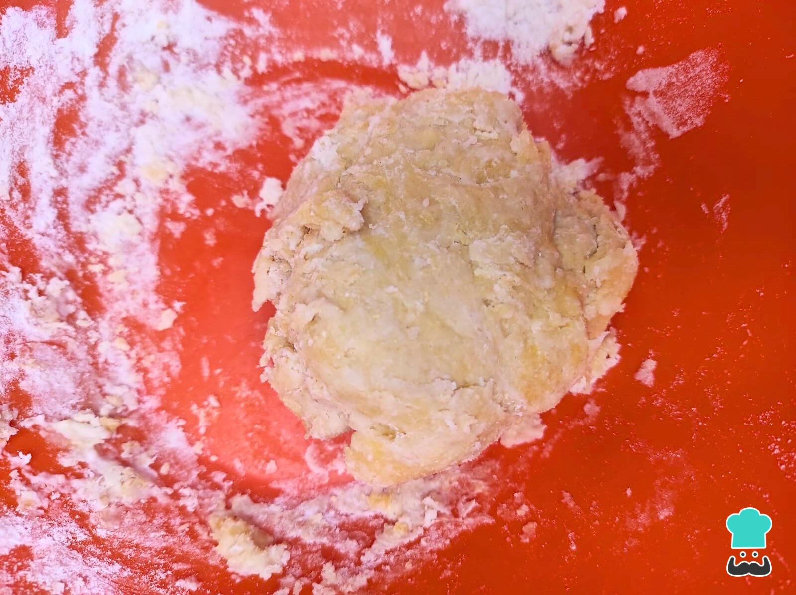 Mezcla y amasa, primero con una cuchara de palo y, después, con las manos para integrar todo de manera uniforme y formar una masa. Agrega agua si es necesario, aquí añadimos dos cucharadas aproximadamente, pero incorpórala de a poco y ve probando. Envuelve en plástico de cocina y deja reposando en el refrigerador mínimo 30 minutos.