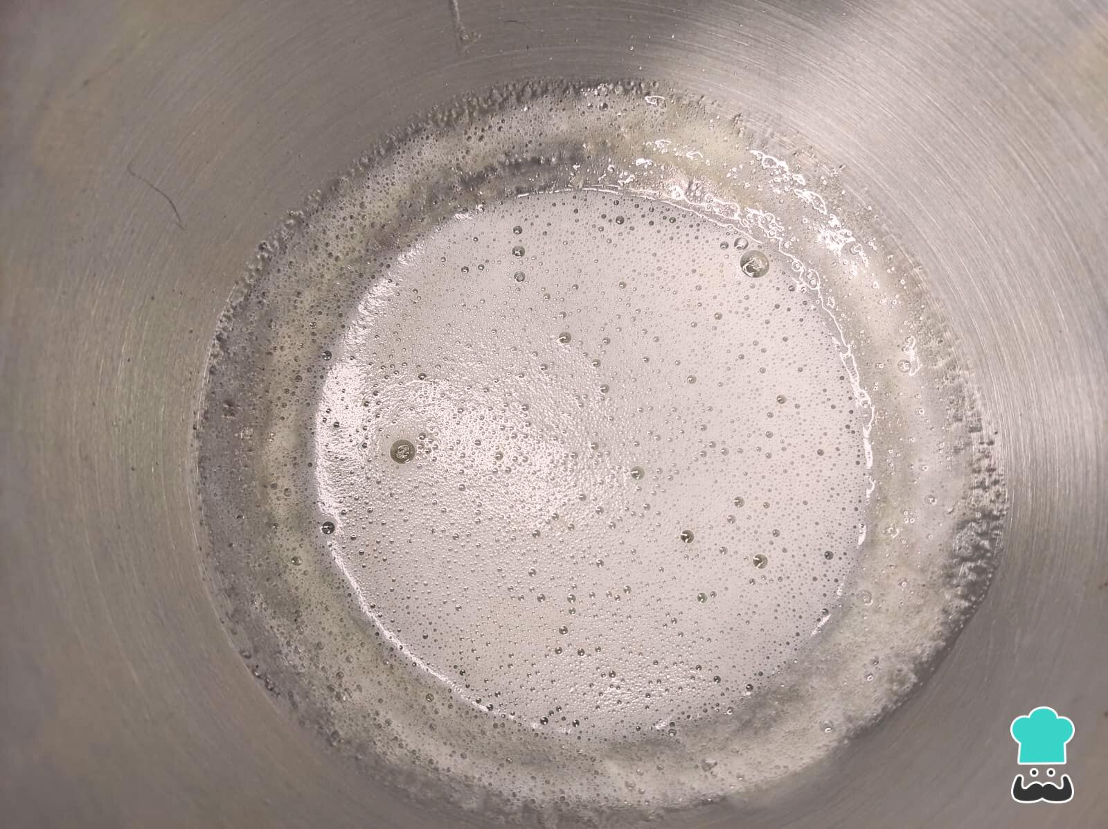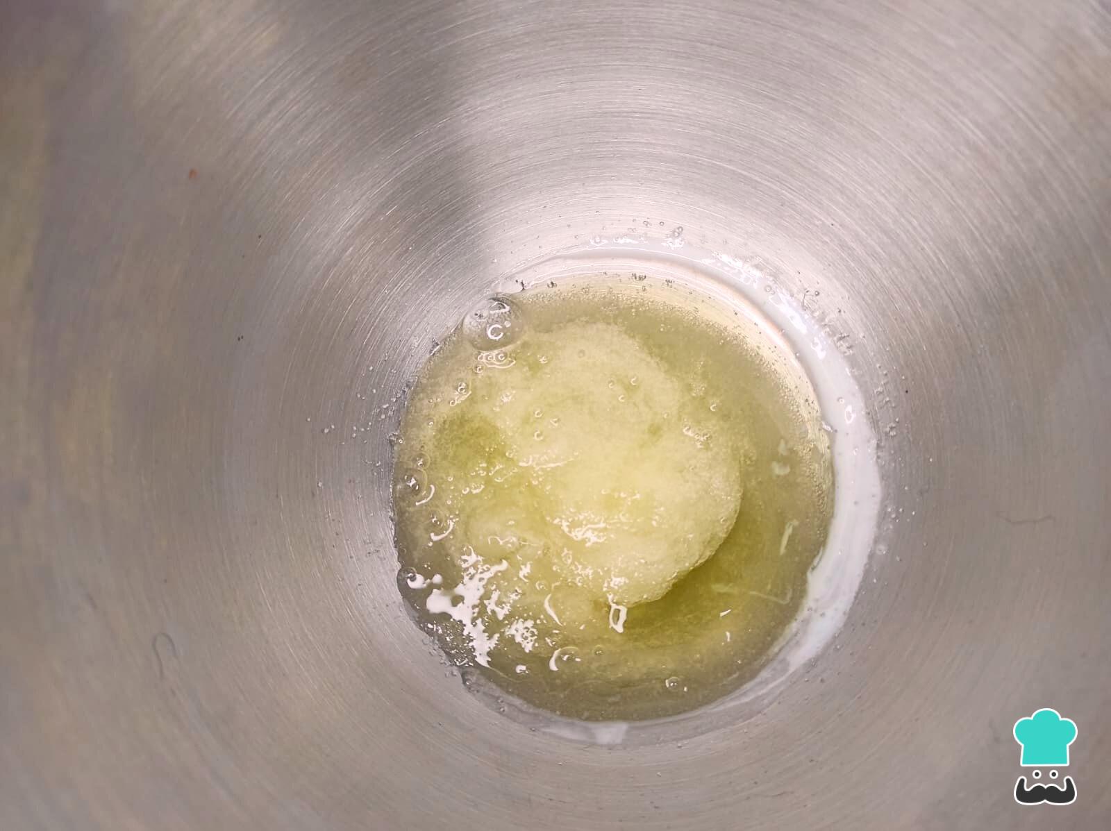 Mezcla todo el rato hasta que el azúcar se disuelva, esto es rápido, de 3 a 5 minutos. Para estar seguros que el azúcar se disolvió, retira un poquito del batido y frótalo entre los dedos: Si no sientes granitos está listo.