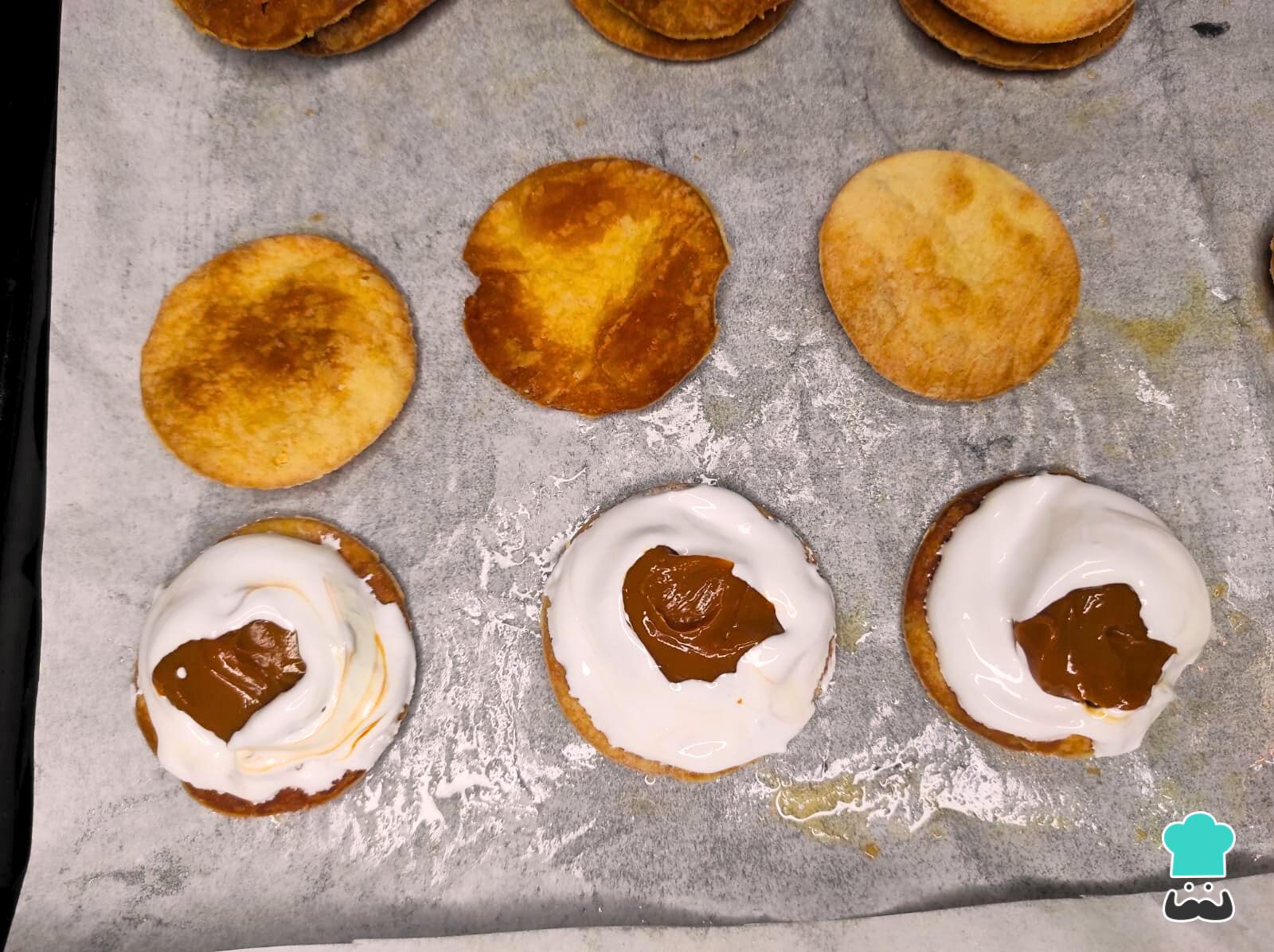 Coloca manjar en el centro de una tapa de hojarasca y añade merengue alrededor.