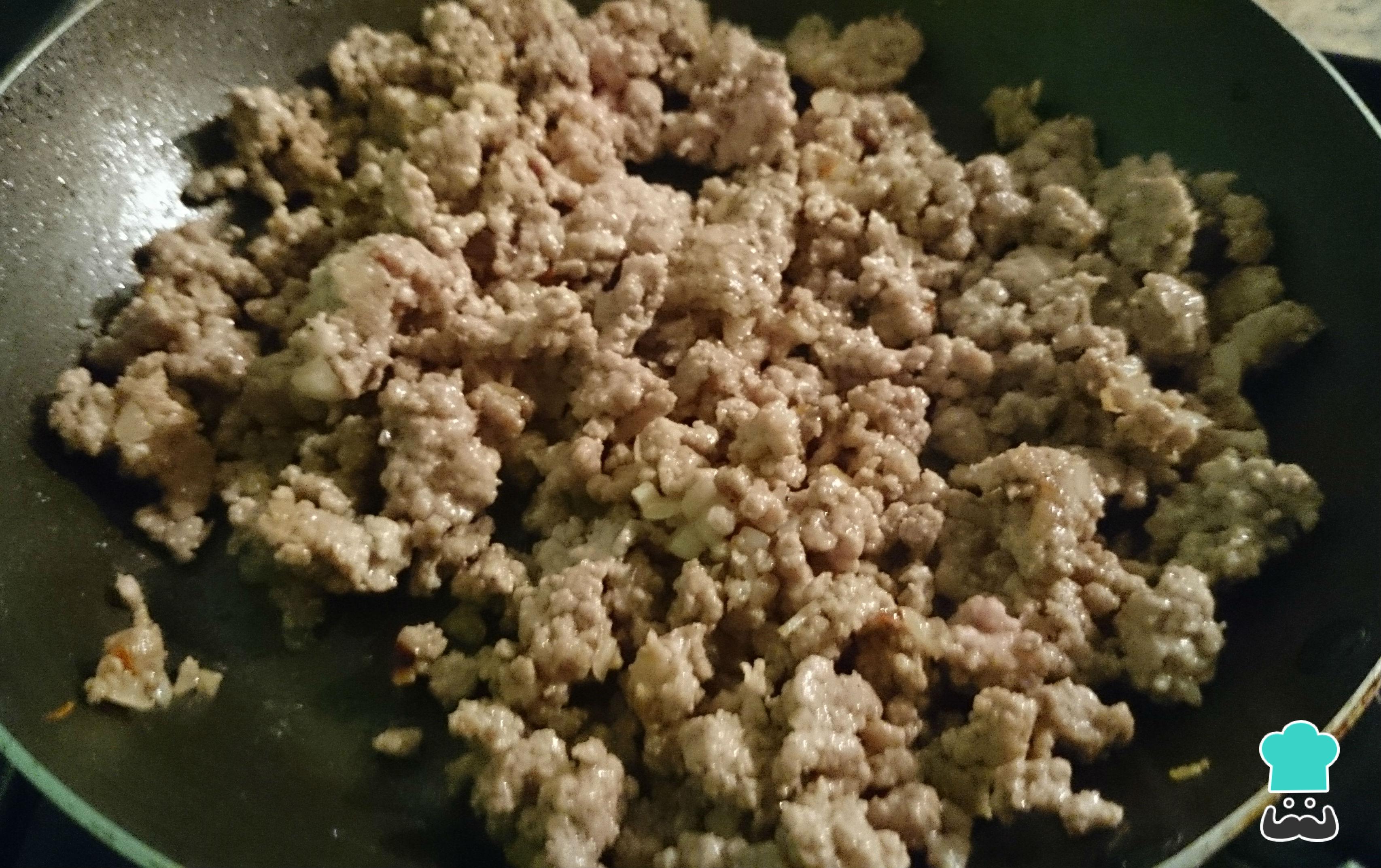 Para el relleno de los chiles en nogada originales de Puebla, en una sartén caliente pon un poco de aceite, agrega la carne y déjala cocer por unos minutos.