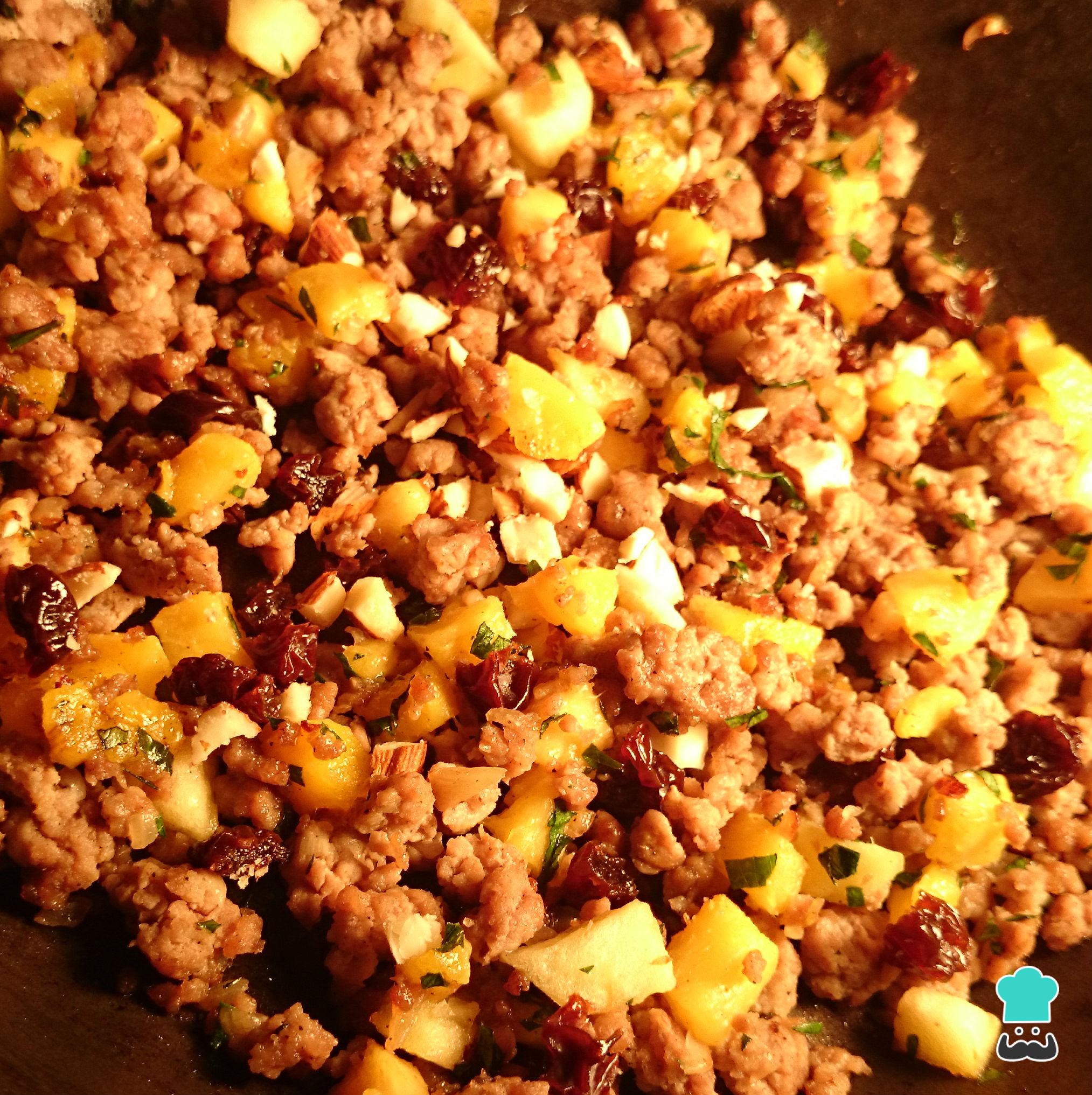 Pica todas la frutas y las semillas en trozos pequeños y añádelas a la carne. Déjalas cocer a fuego medio por 10 minutos o hasta que las frutas estén suaves. Sazona con un poco de sal y pimienta. Reserva.